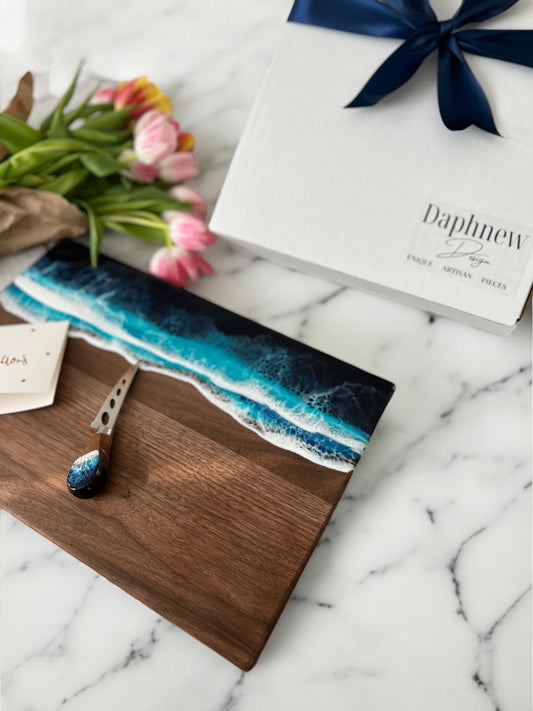 Surfboard Cutting Board and Cheese Knife Set with Resin Ocean Wave