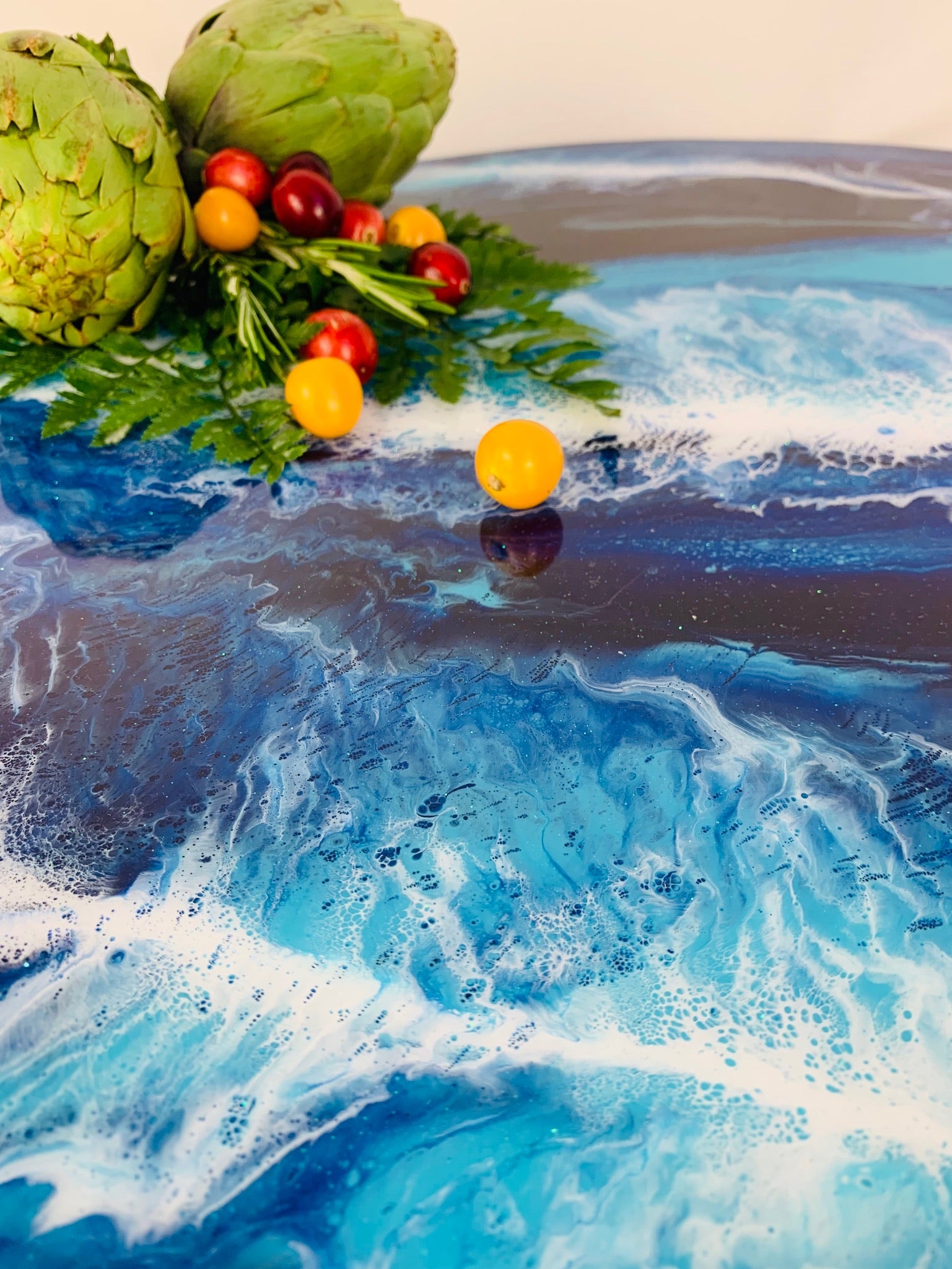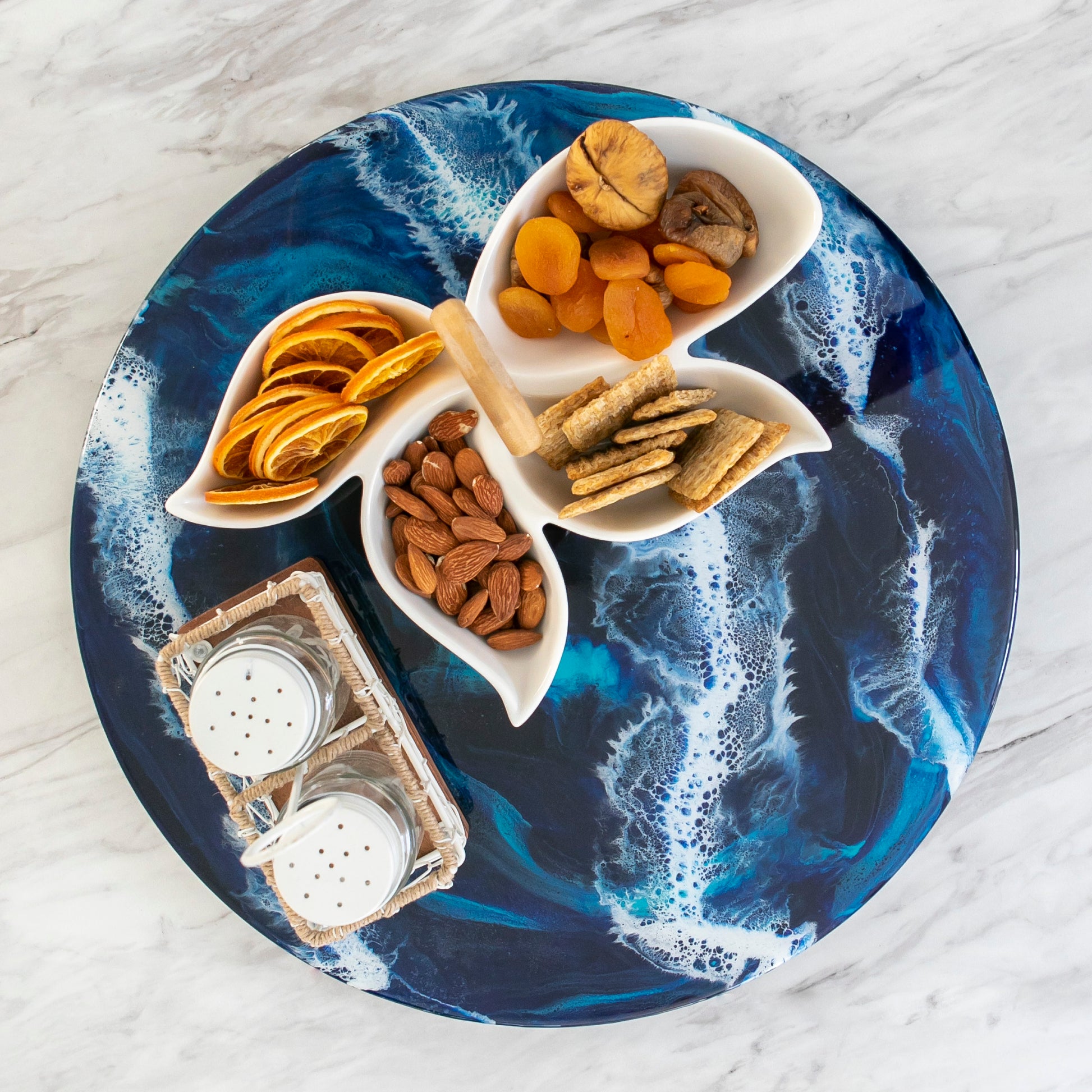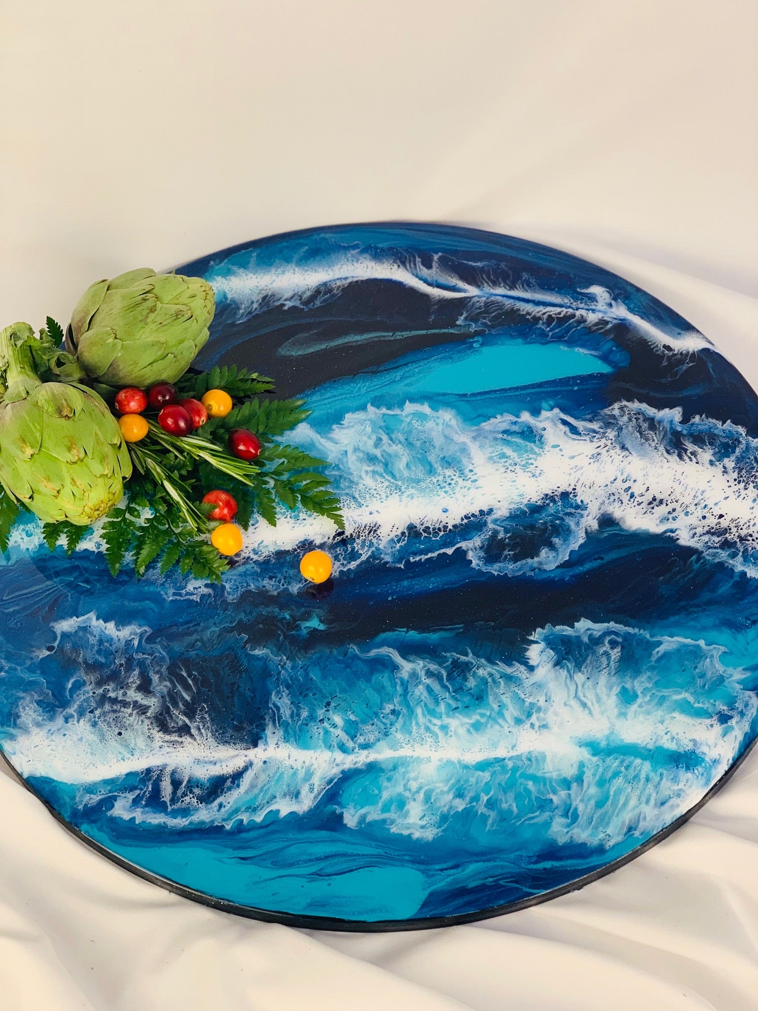 Ocean Resin Lazy Susan, a stunning 20-inch wooden turntable that combines functionality with ocean-inspired artistry. Handcrafted from premium wood, this large lazy susan features swirling resin designs in shades of blue and turquoise, combined with white foamy waves gives you a depth of the ocean.This gorgeous piece is the fruit of three days of work. Wherever you place this glamorous piece it will be the center of attention and fully functional same time.