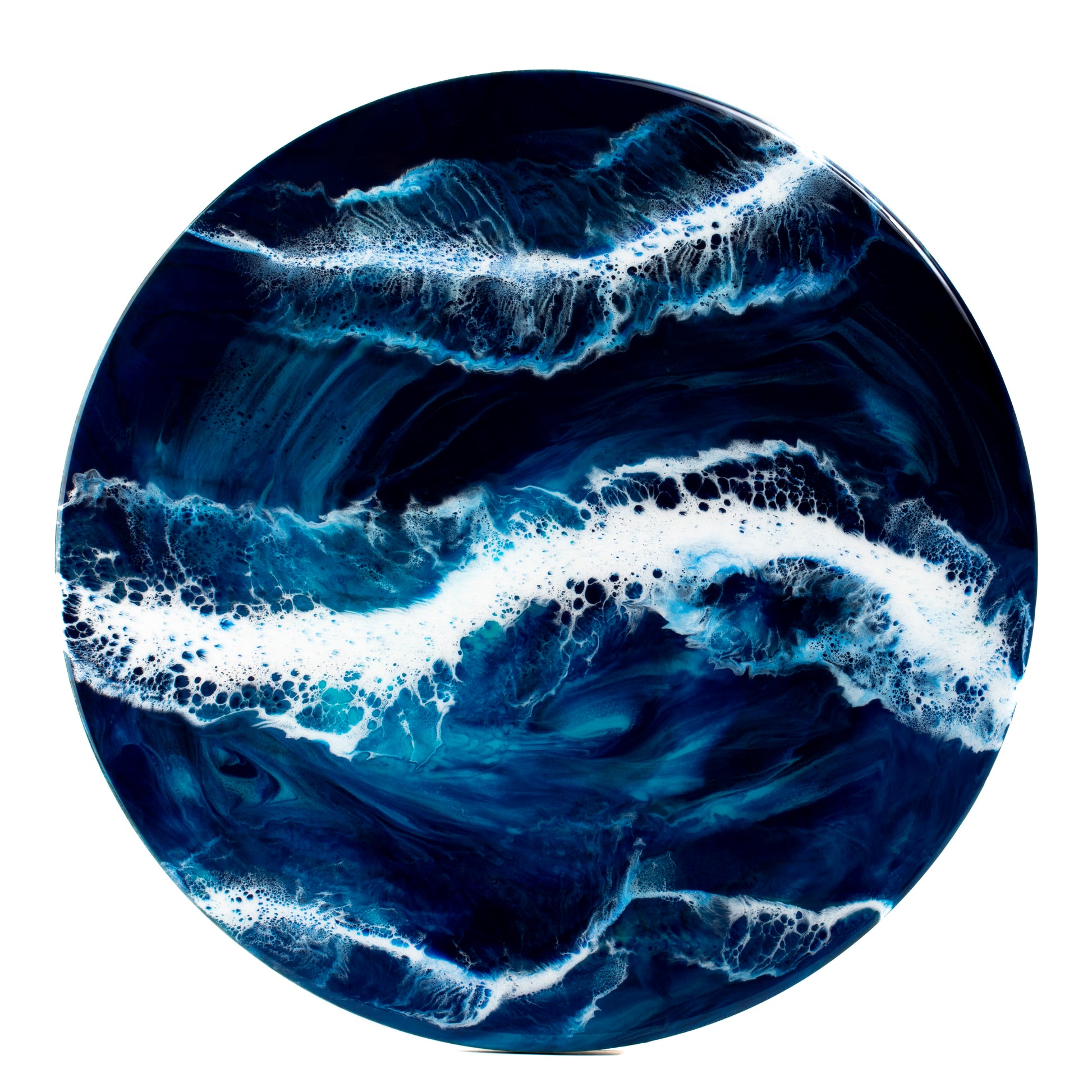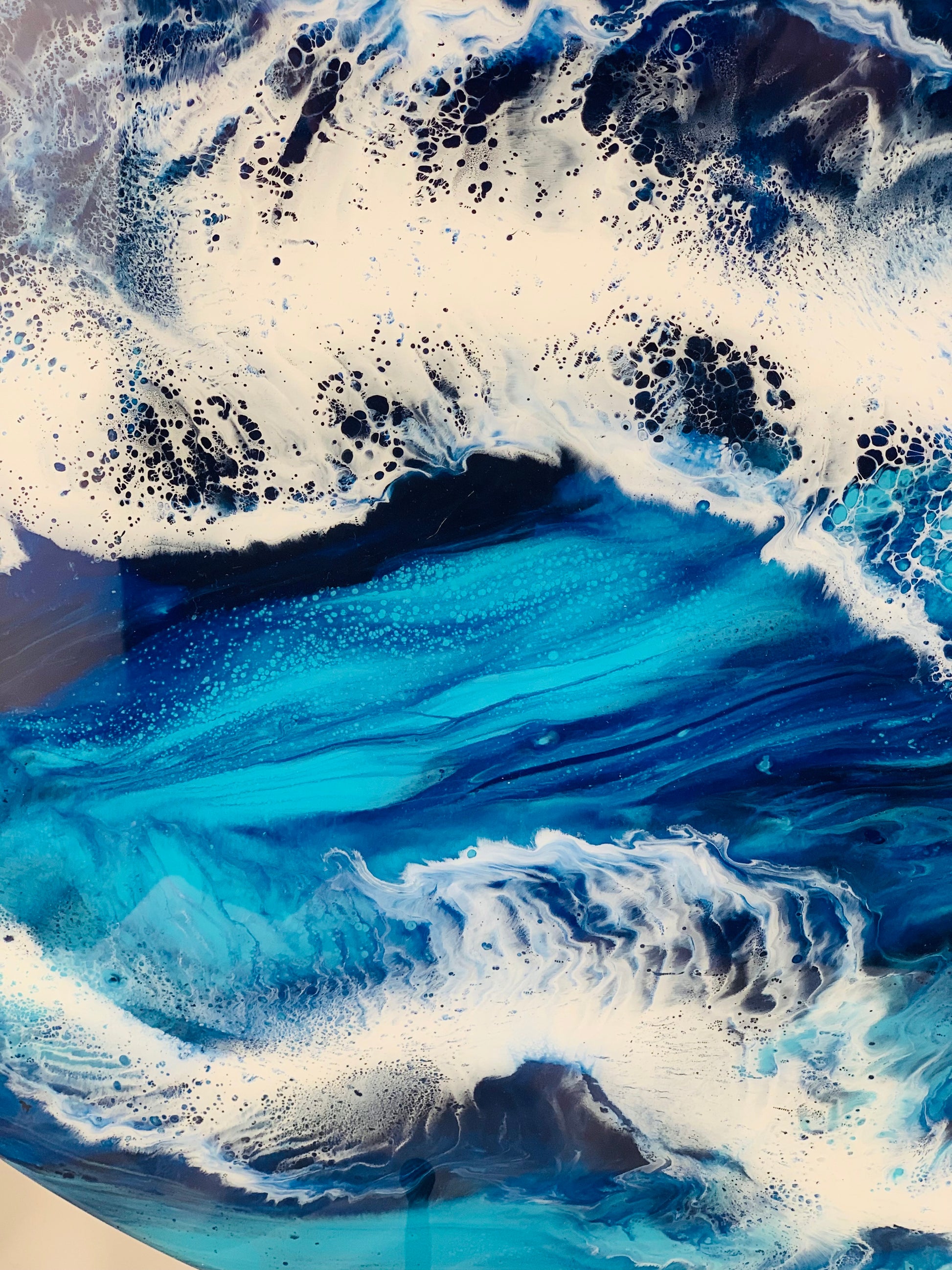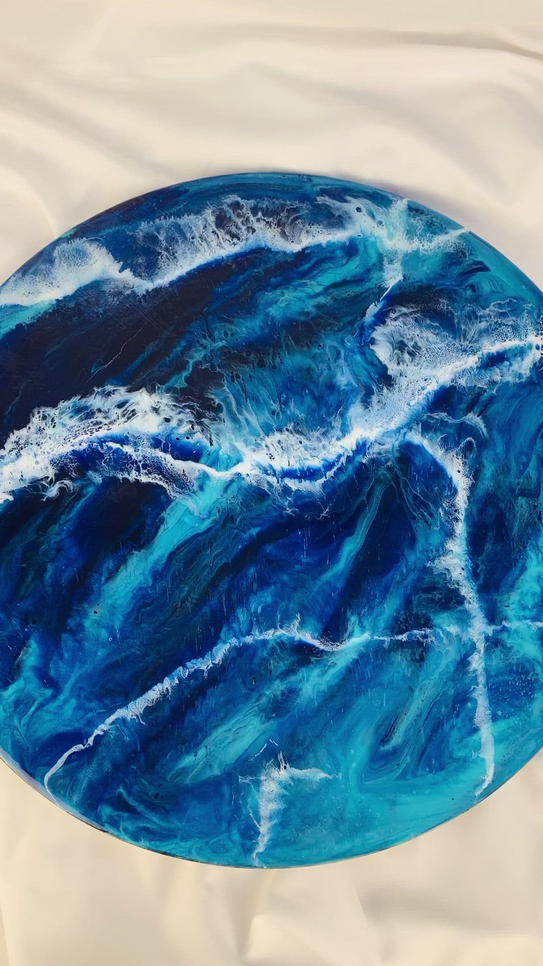 - Unique ocean-inspired resin artwork in shades of blue and white