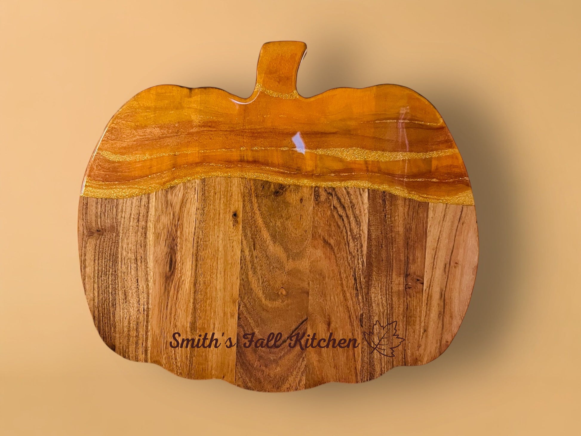 ✔ Charming Fall-Inspired Design – Showcasing rich amber, copper, and gold resin tones that capture the essence of autumn, beautifully flowing across a pumpkin-shaped acacia board.