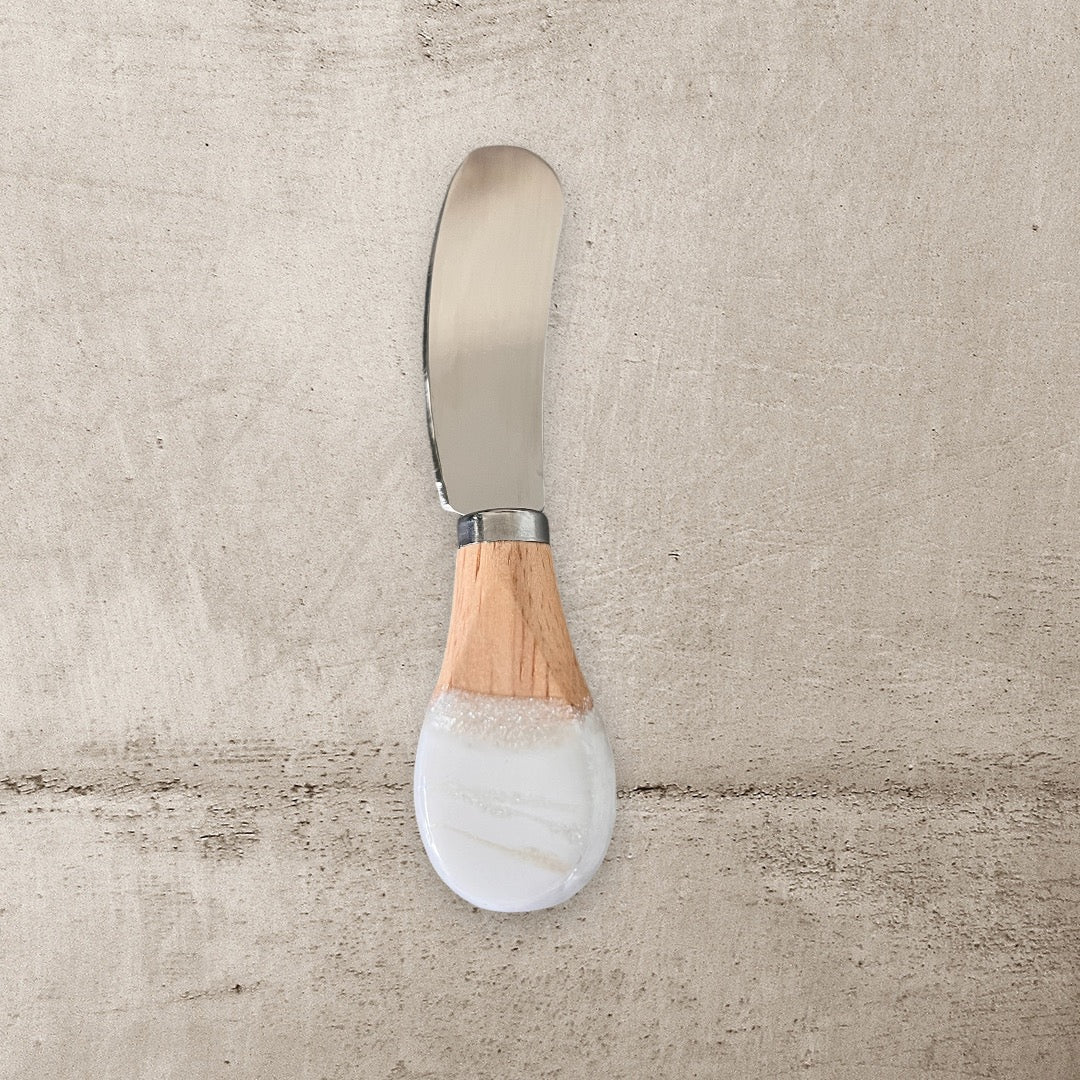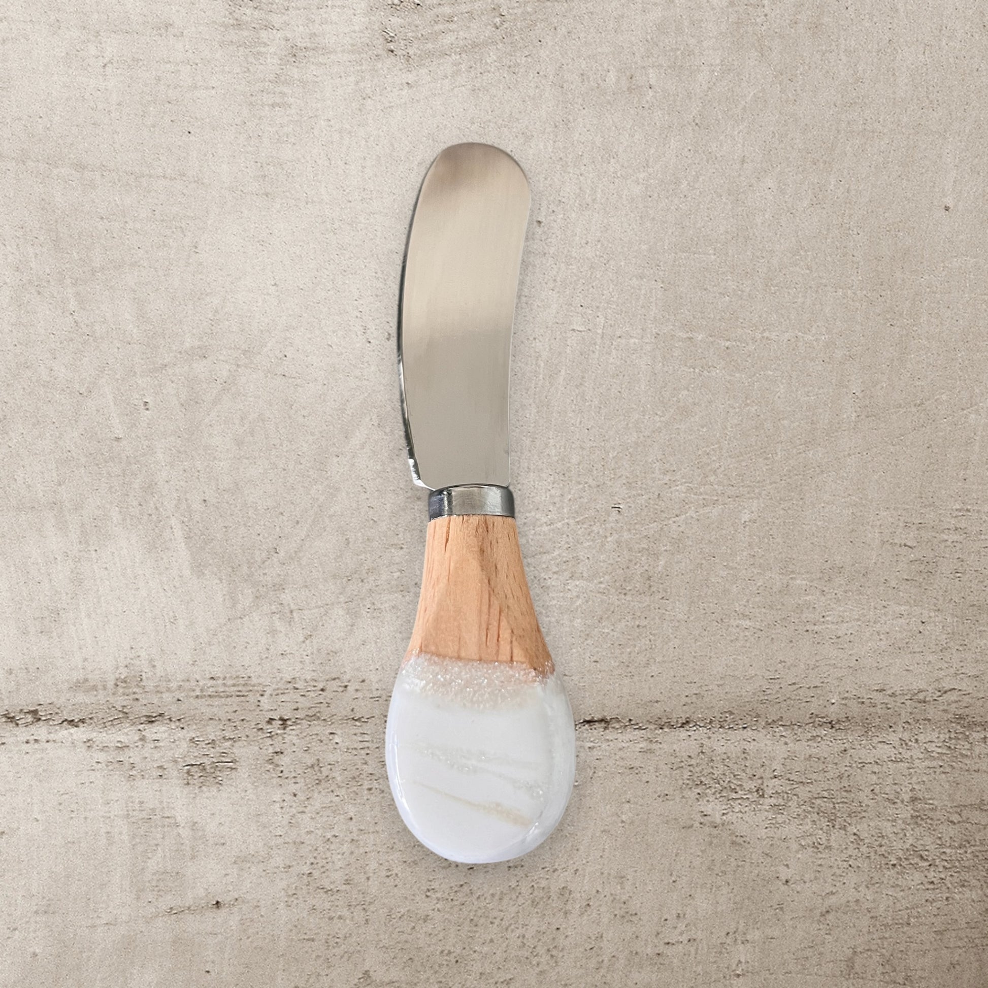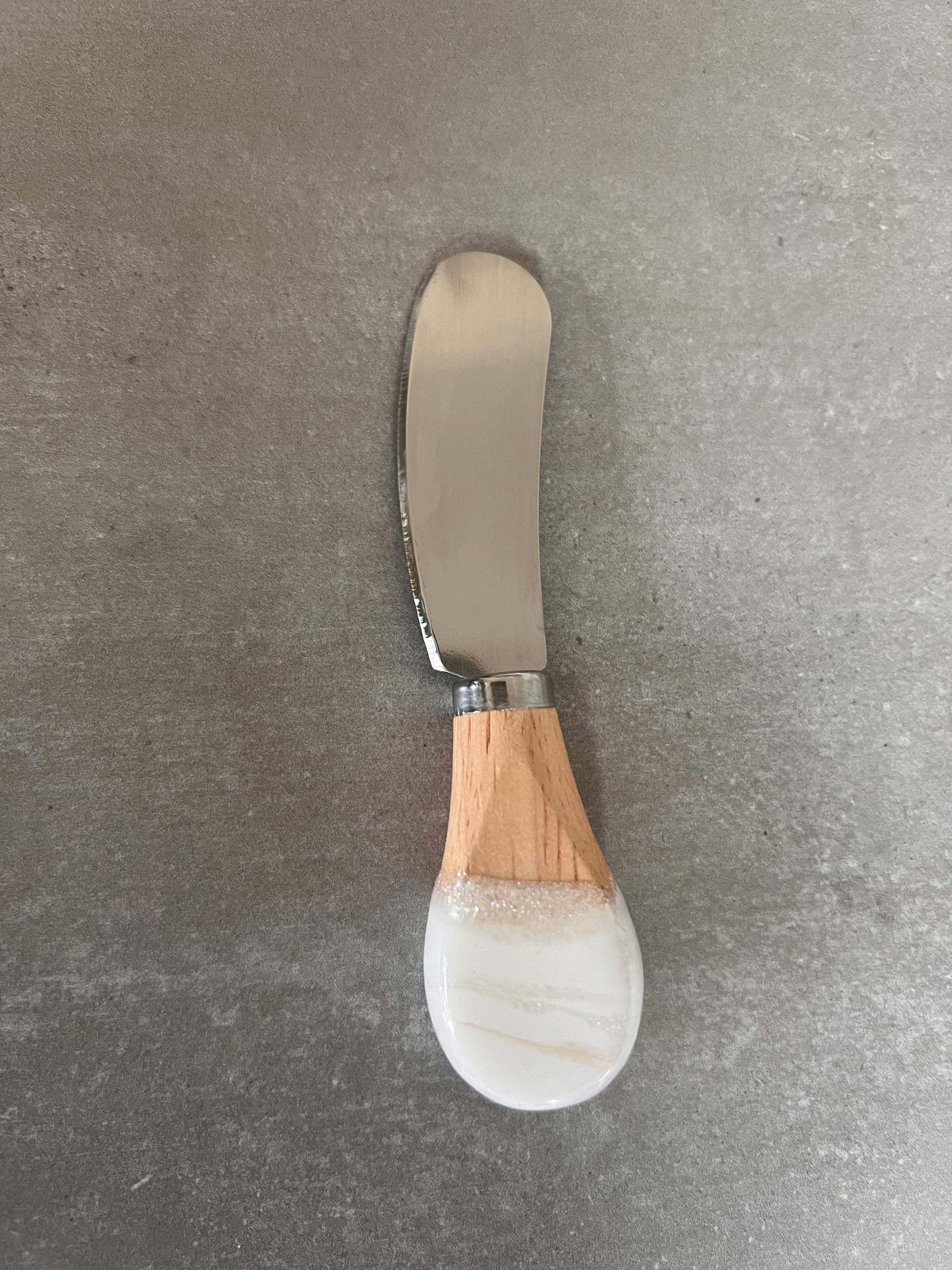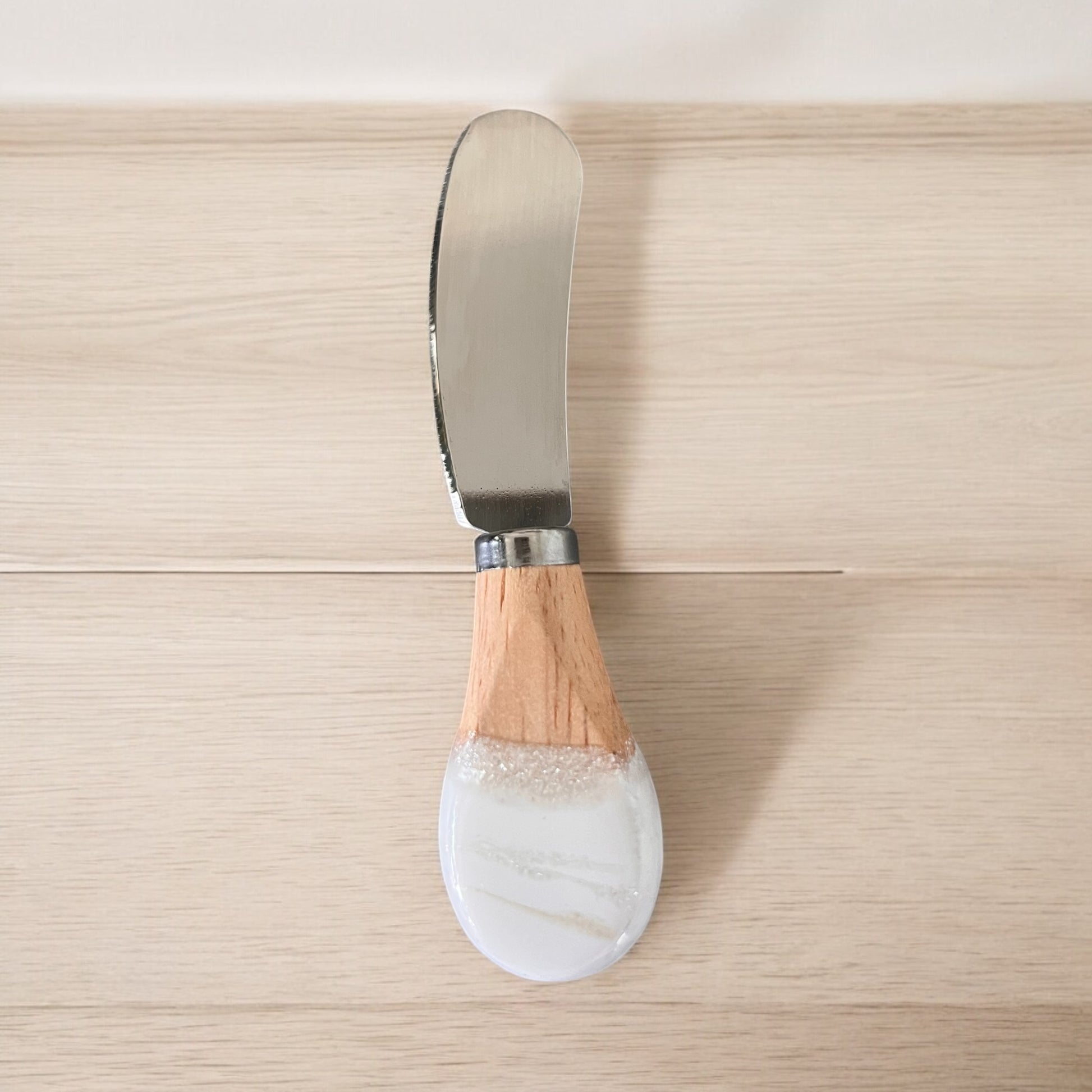 Add a touch of elegance to your table with this Cheese/ Butter Knife, featuring a beautiful white resin with glitter design. Perfect for spreading butter, jams, and more, this unique piece combines functionality with a hint of sparkle.