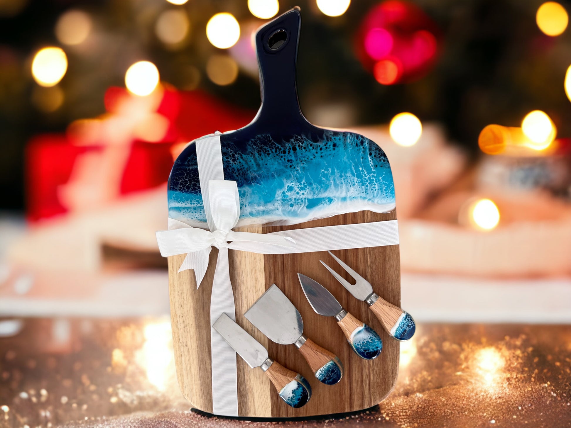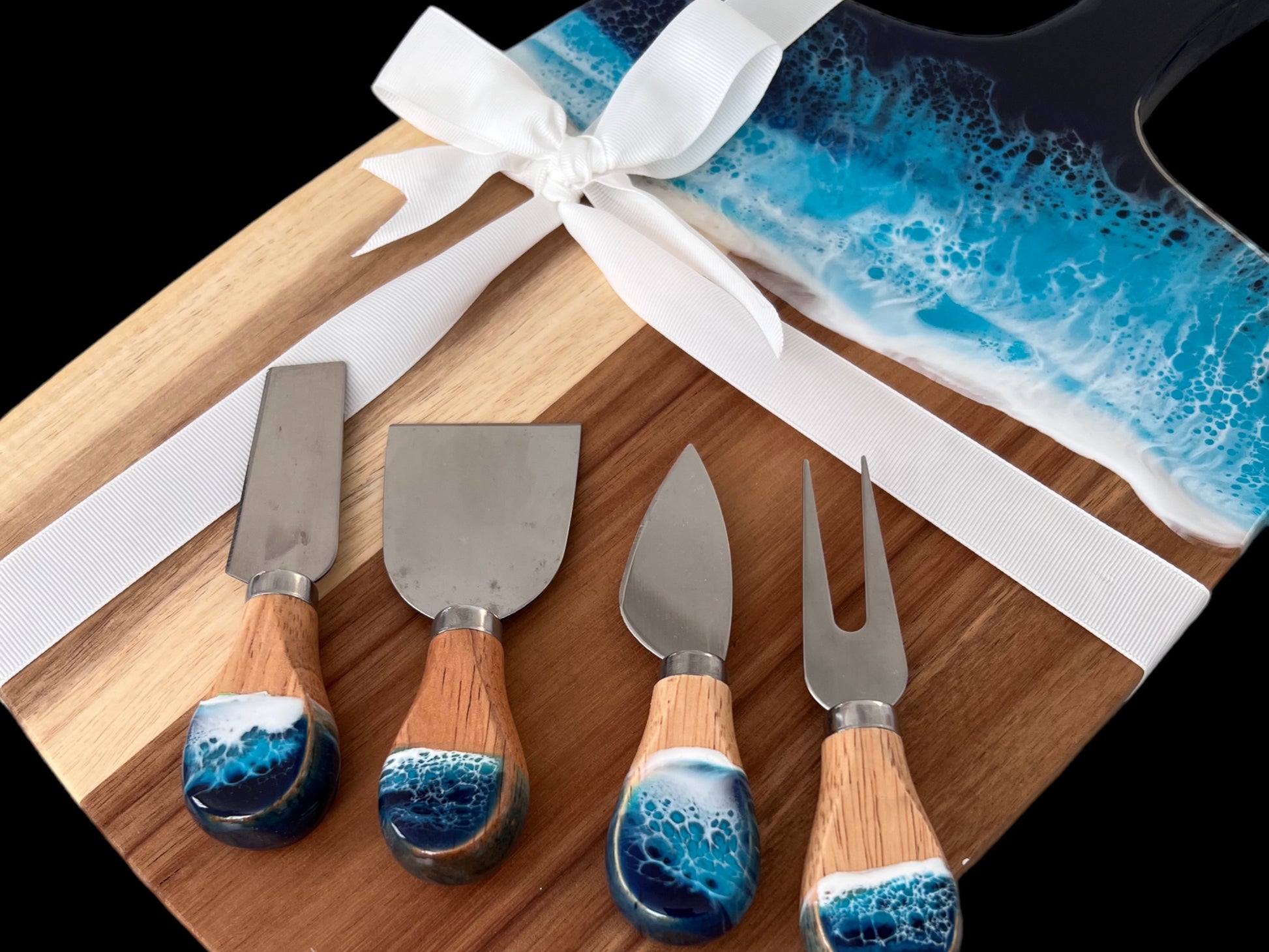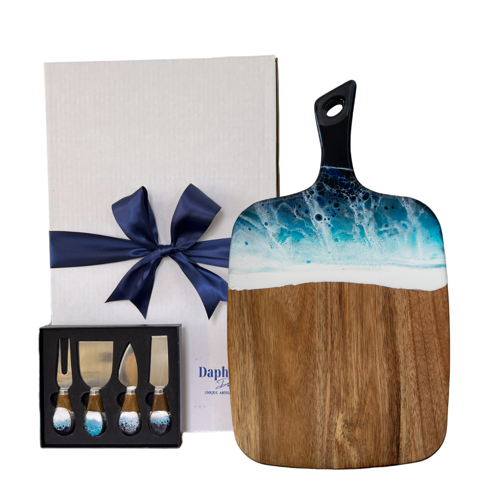This stunning handmade cutting board set features rich acacia wood with an ocean-inspired resin design, bringing coastal beauty to any kitchen. Paired with a stainless steel cheese knife set, it’s perfect for serving charcuterie, cheeses, and appetizers. A thoughtful gift for ocean lovers, weddings, housewarmings, or any special occasion. Handcrafted in New Jersey, USA.