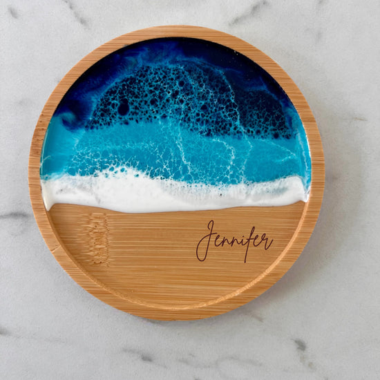 This ocean-inspired ring dish is handcrafted with natural wood and flowing resin designed to resemble gentle ocean waves. Perfect for holding rings, earrings, or small jewelry pieces on a bedside table, vanity, or bathroom counter.