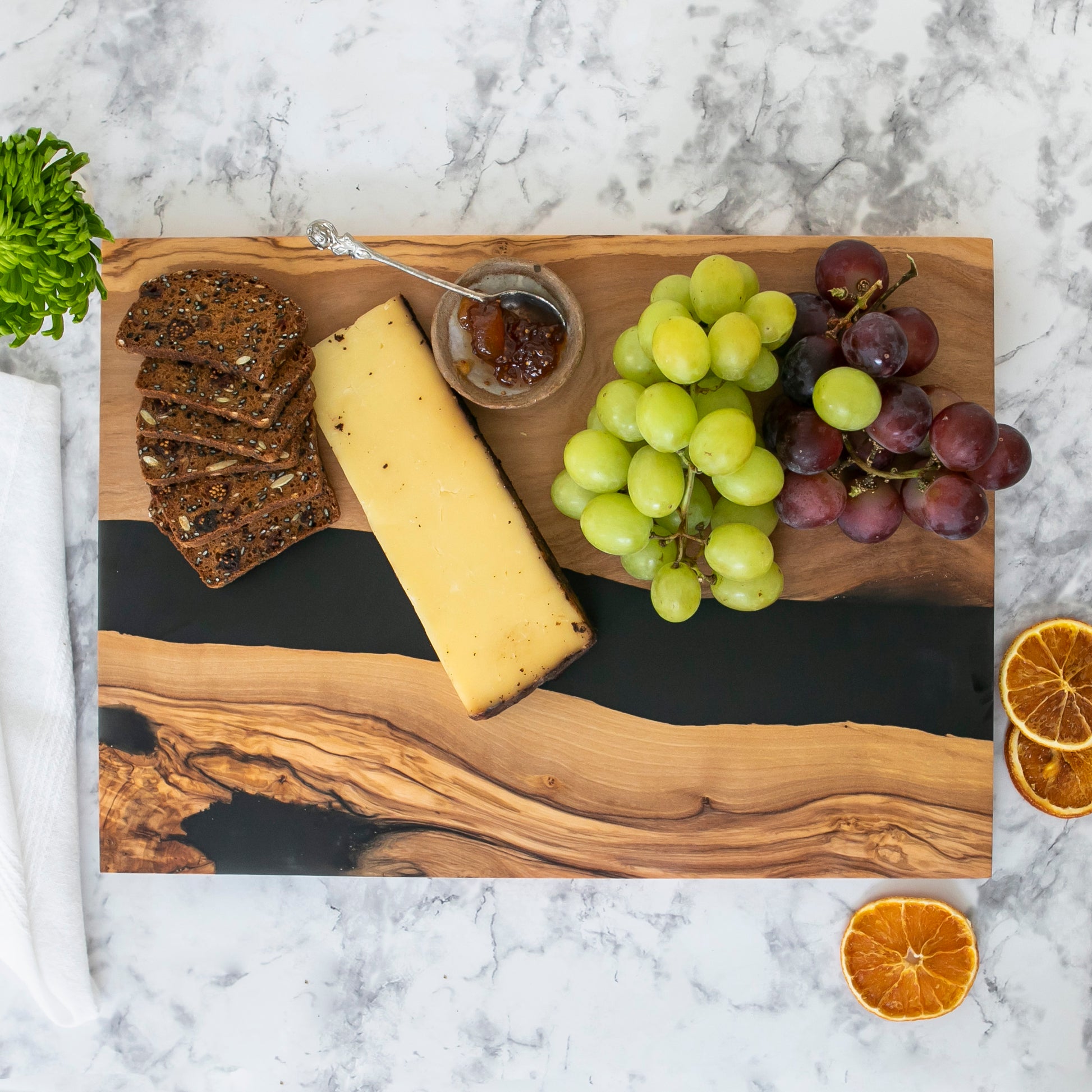 River Board For Charcuterie and Cheese, Olive Wood River Board with Black Resin