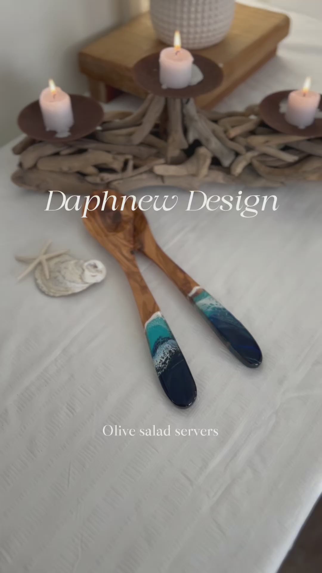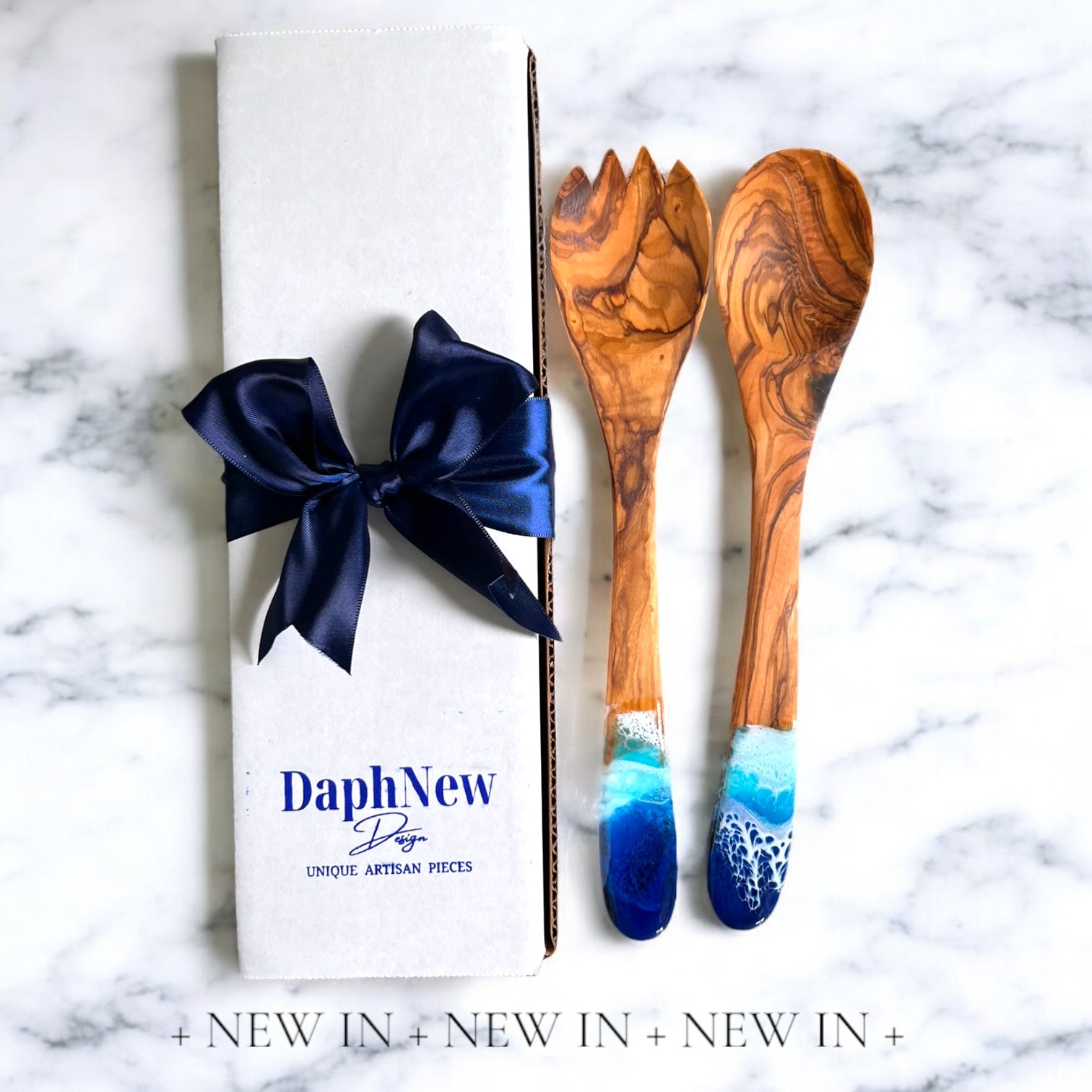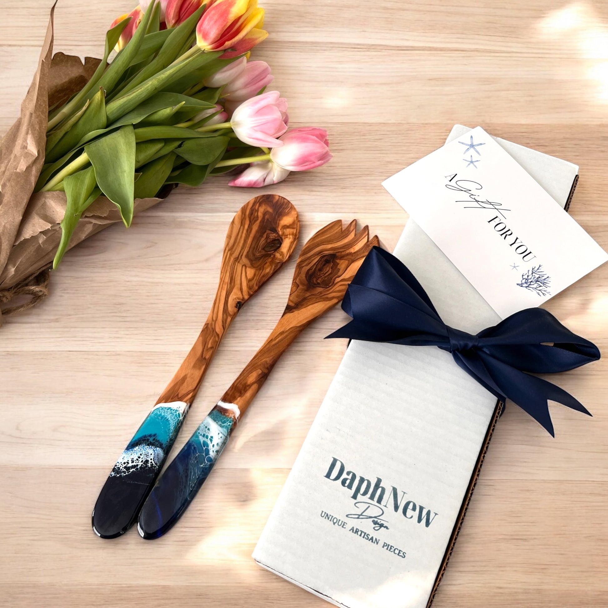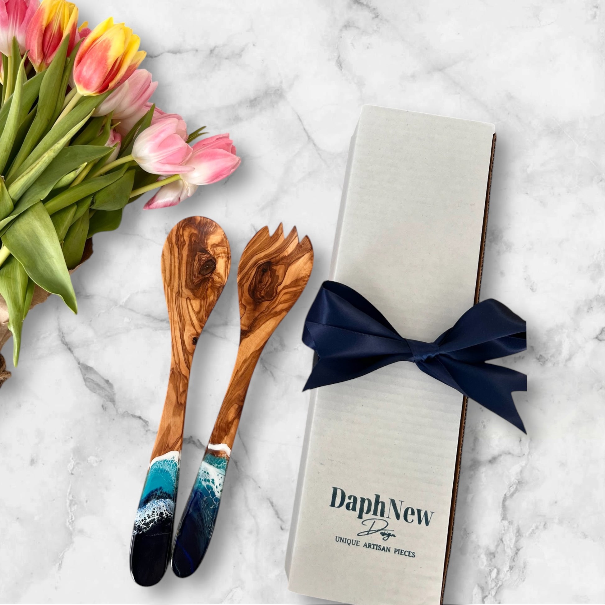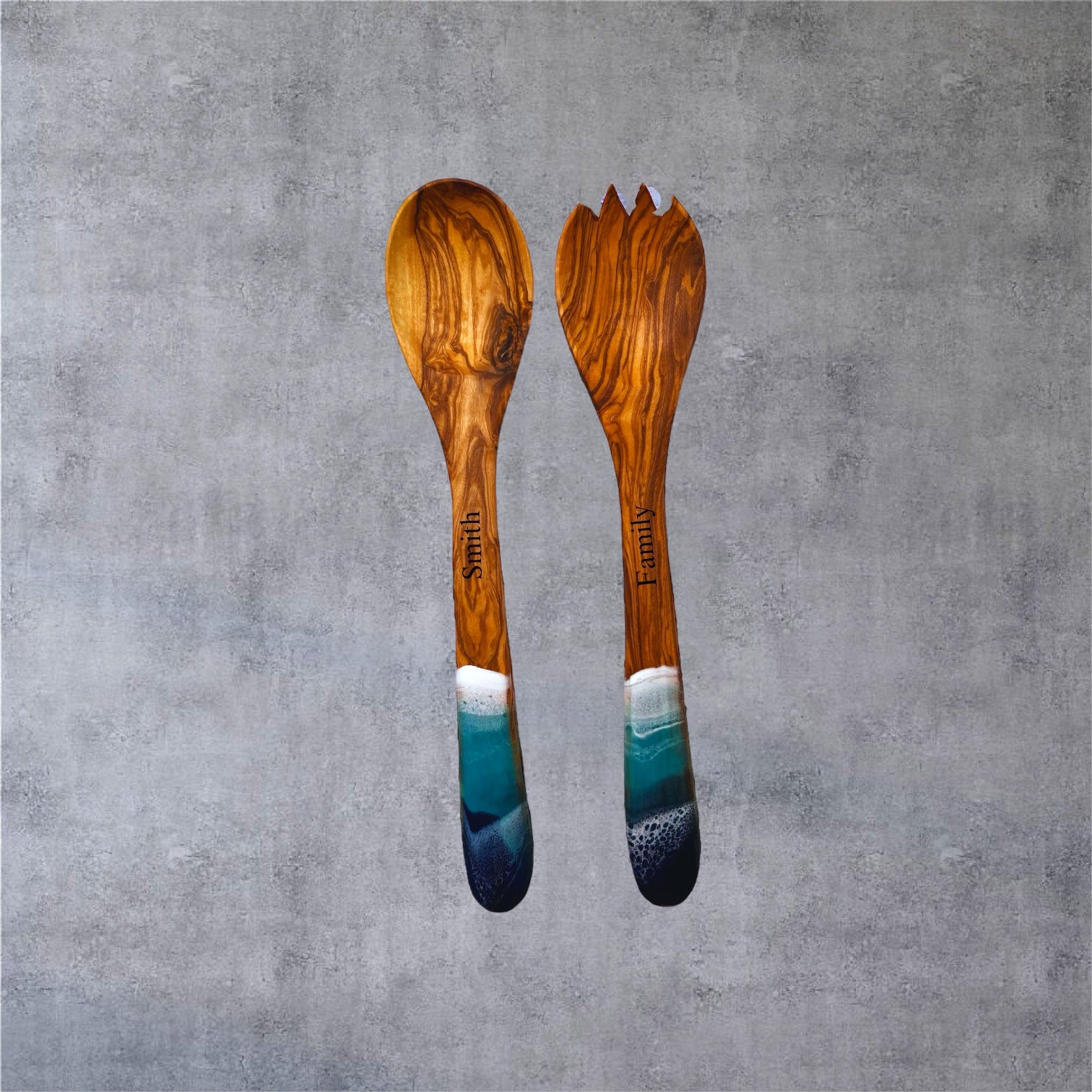 Olive Wood Salad Server Set with Ocean Resin – Personalized Spoon Gift Set
