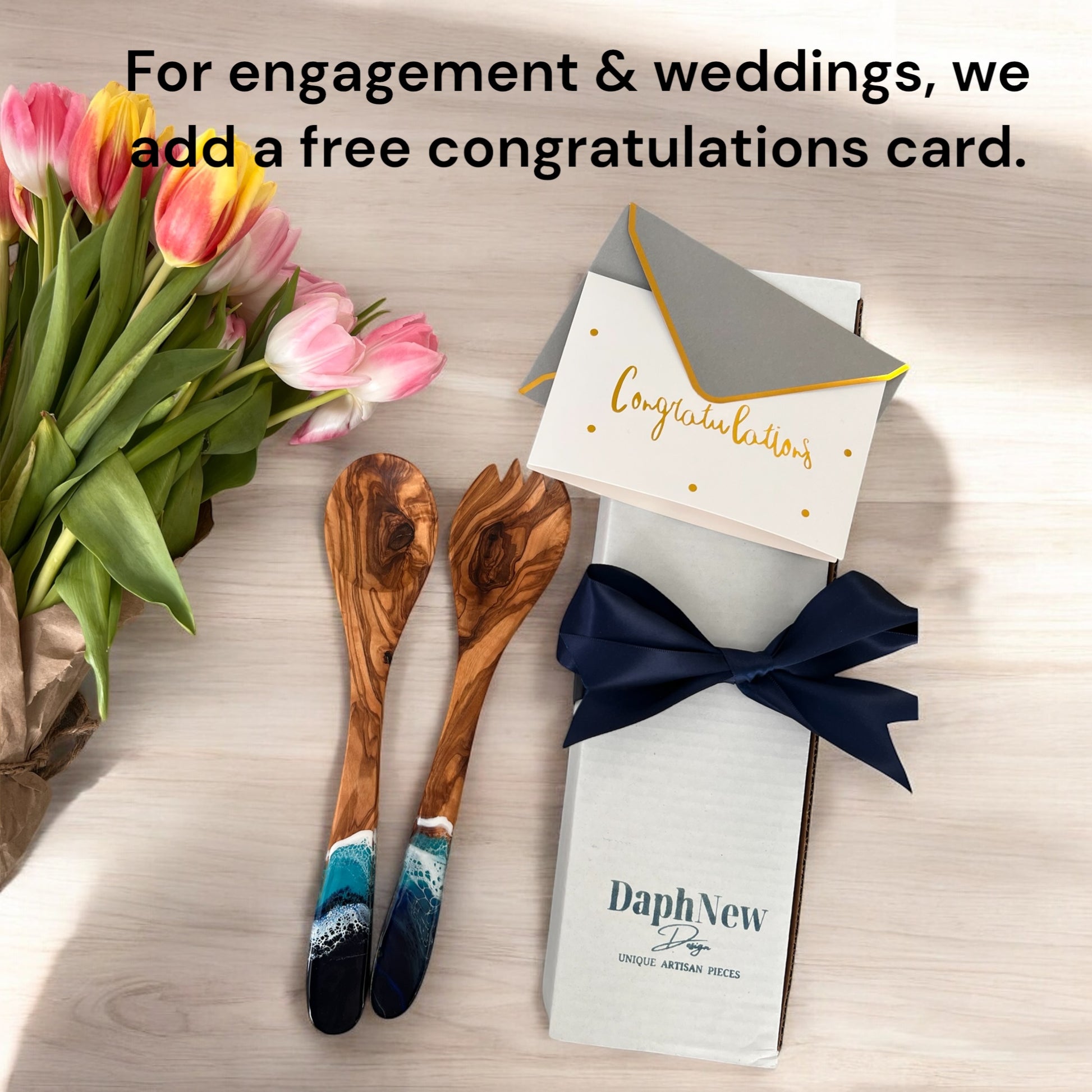 Our Olive wood Salad Server Set with Ocean Resin comes beautifully gift-boxed with a ribbon, making it an elegant and meaningful present. Olive wood symbolizes strength and unity, blending beauty and strength. Making this set a great gift for wedding or coworker who likes to cook.