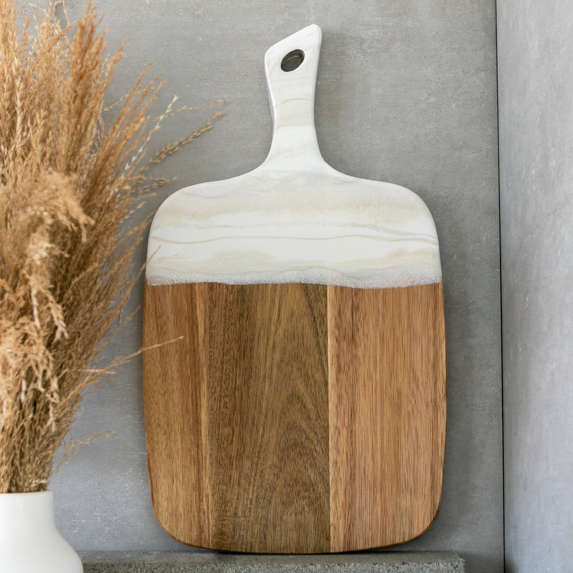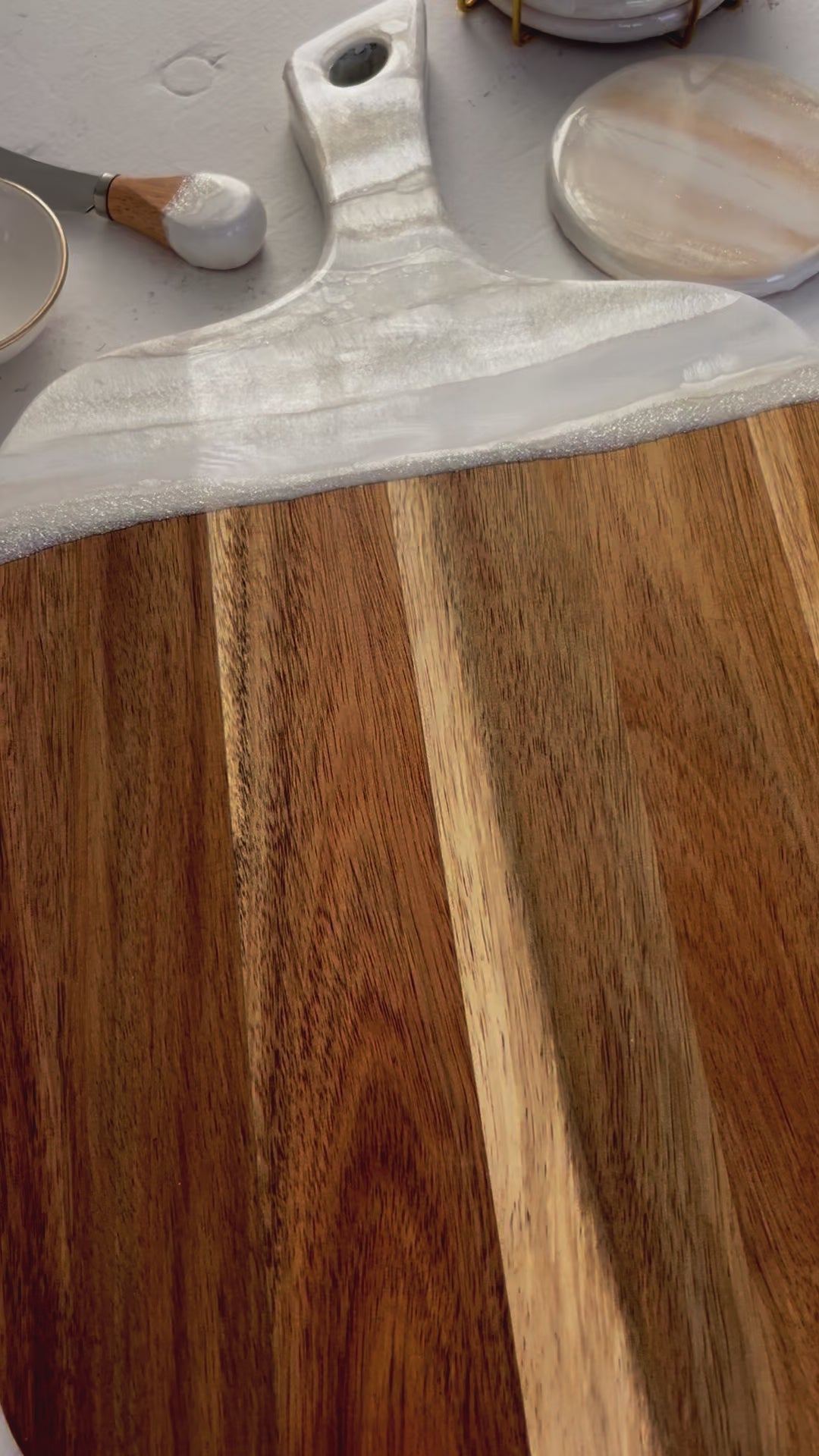 - Personalized Acacia wood serving board with white shimmery resin accents