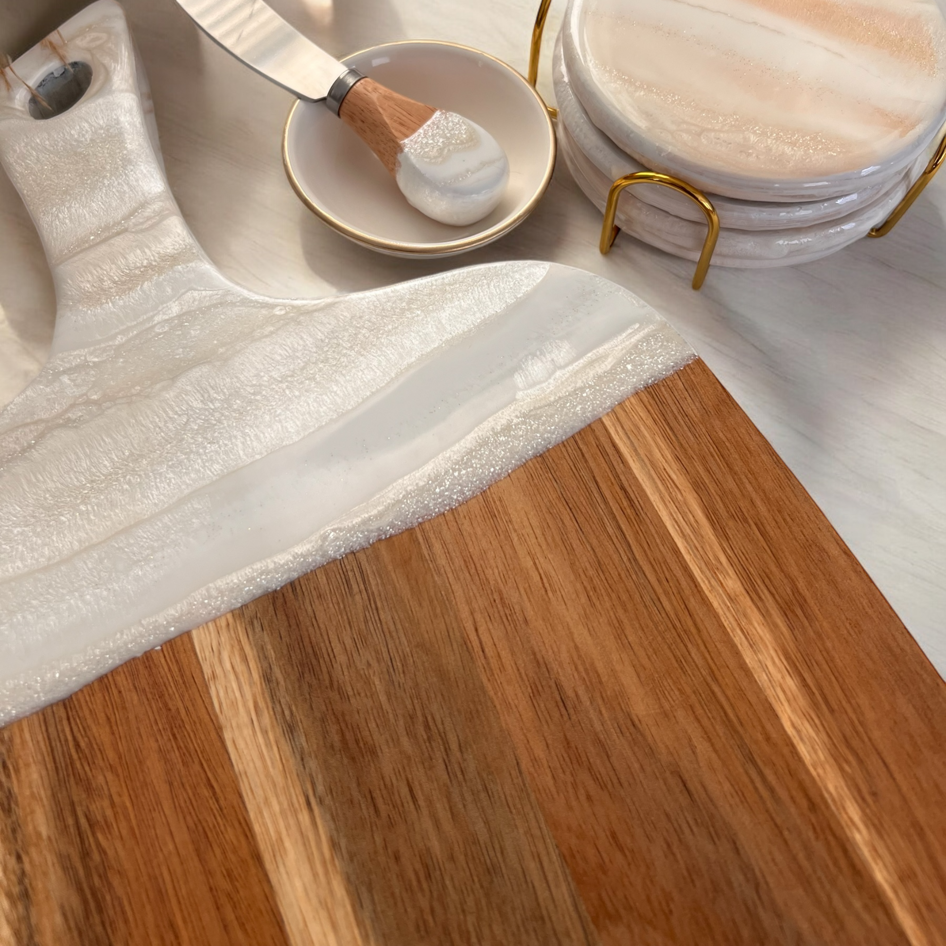 Perfect for weddings, engagements, or special celebrations, this set brings sophistication and style to any home. The warm acacia wood, combined with the shimmering white resin, gold accents, and personalized touch, makes it a memorable gift for couples and anyone who loves elegant decor.