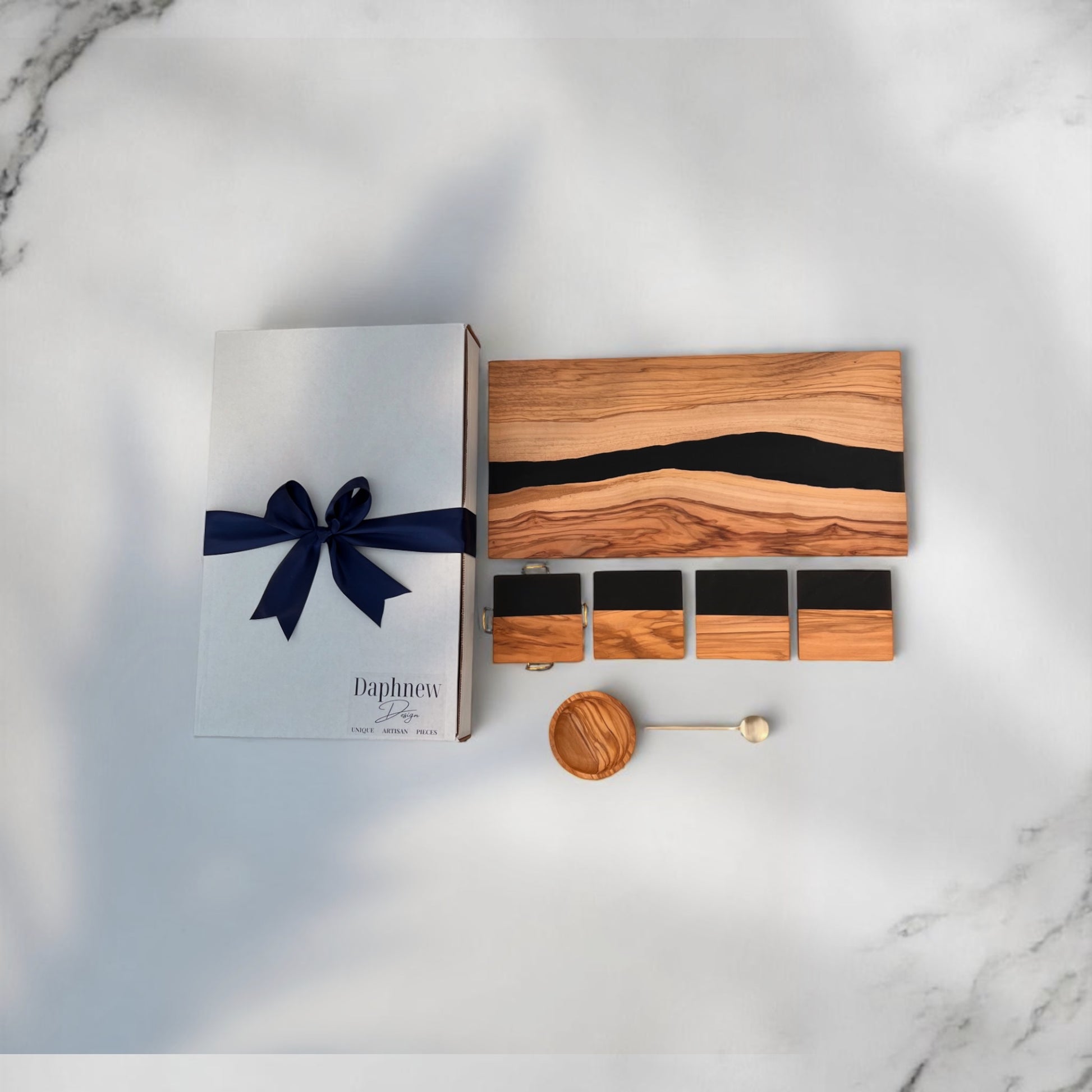 This River Board Resin board gift set, crafted from live-edge olive wood and blue resin, is the perfect gift for any special occasion. Packaged beautifully in a gift box, it’s great for weddings, engagements, 5 year anniversary gift or 10 years, or as a thoughtful gift for parents. The stunning resin river design adds a touch of elegance to any home.