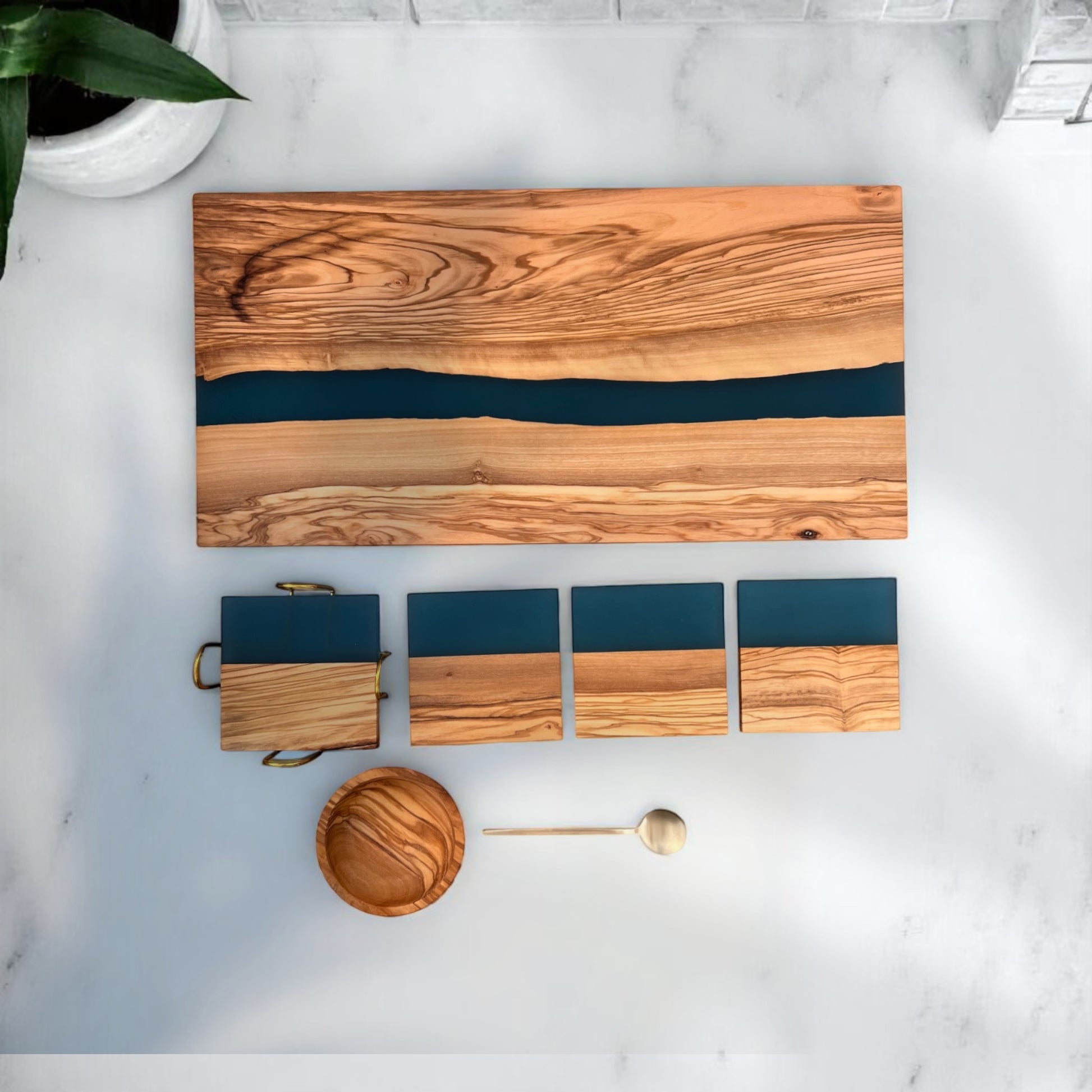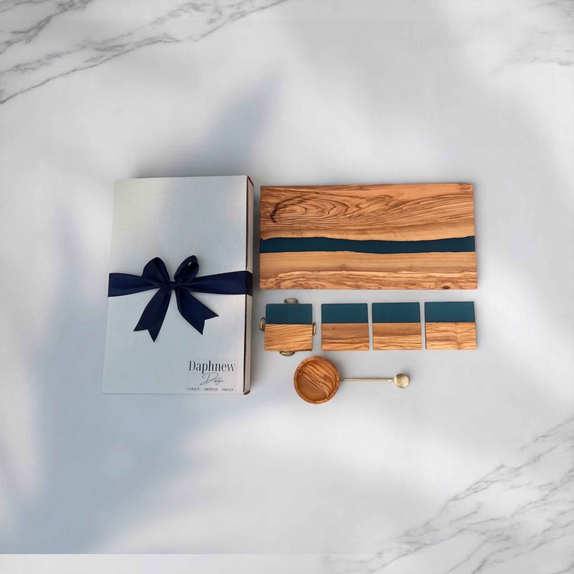 This River Board Resin board gift set, crafted from live-edge olive wood and blue resin, is the perfect gift for any special occasion. Packaged beautifully in a gift box, it’s great for weddings, engagements, 5 year anniversary gift or 10 years, or as a thoughtful gift for parents. The stunning resin river design adds a touch of elegance to any home.