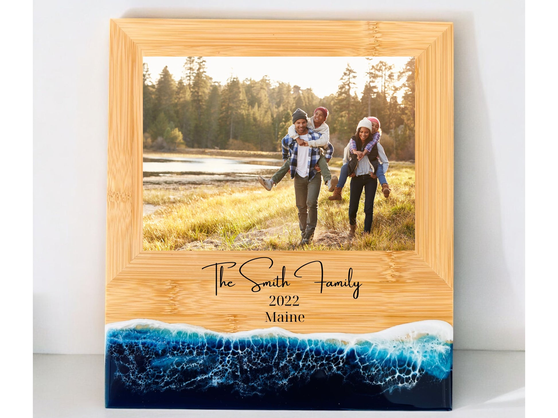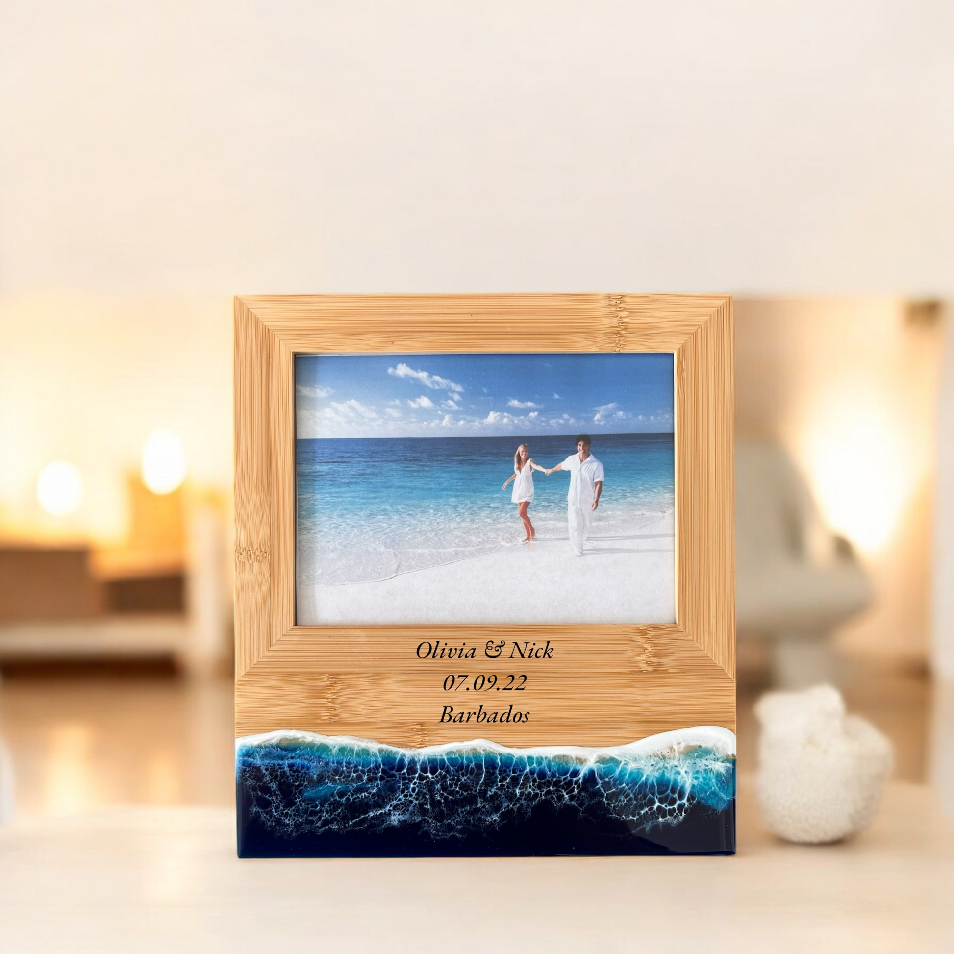 Capture your favorite memories with this Personalized Beach Photo Frame, featuring ocean-inspired resin waves on bamboo wood. Perfect for a 5x7 photo, this coastal-themed frame adds a serene beach touch to any space. A unique and thoughtful gift for beach lovers, weddings, or special occasions.