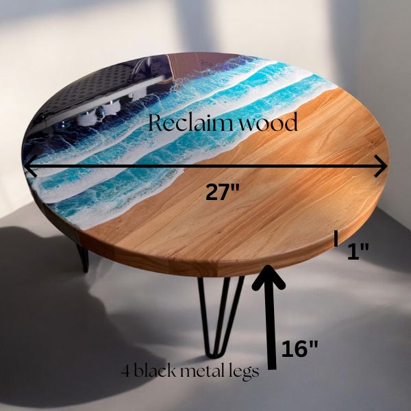 Bring the calming beauty of the ocean into your living space with this stunning Resin Ocean Wave Coffee Table. Crafted from reclaimed rustic elm wood, this 27-inch round tabletop features a breathtaking resin ocean wave design, seamlessly blending natural textures with artistic flair. The wood’s unfinished, rustic charm enhances the table’s authenticity, while the 1-inch thick surface ensures durability and strength.