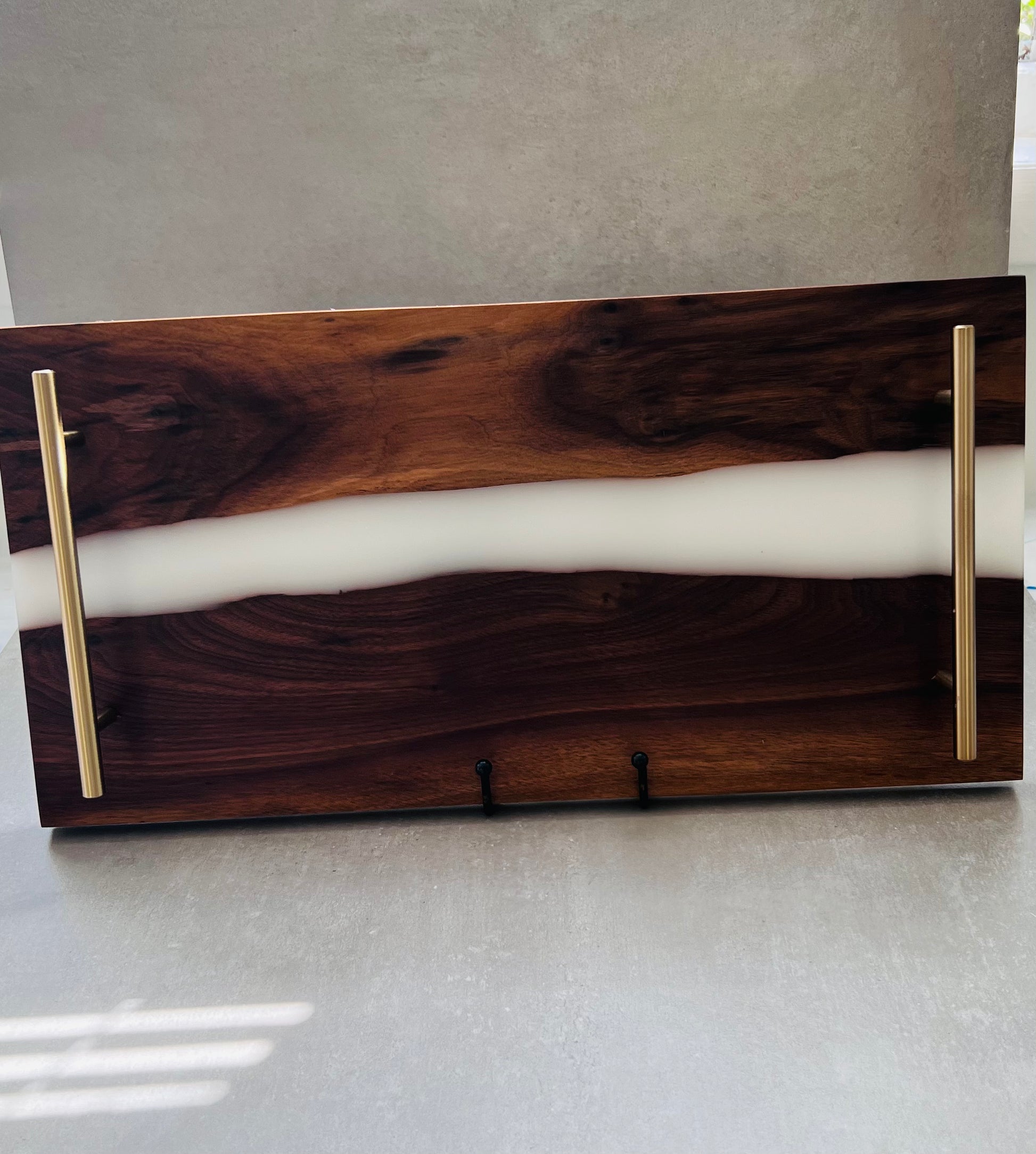 - Handcrafted from live-edge walnut wood with white resin river