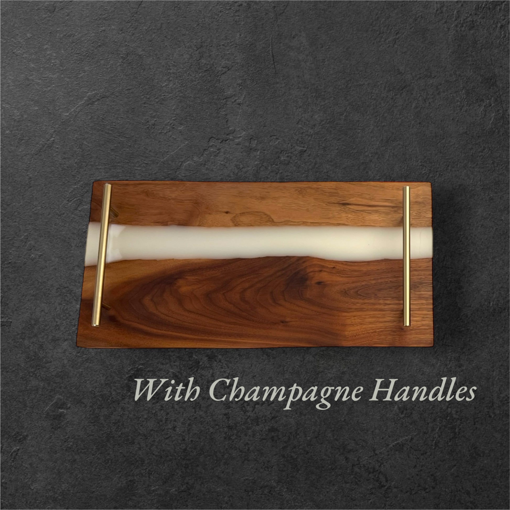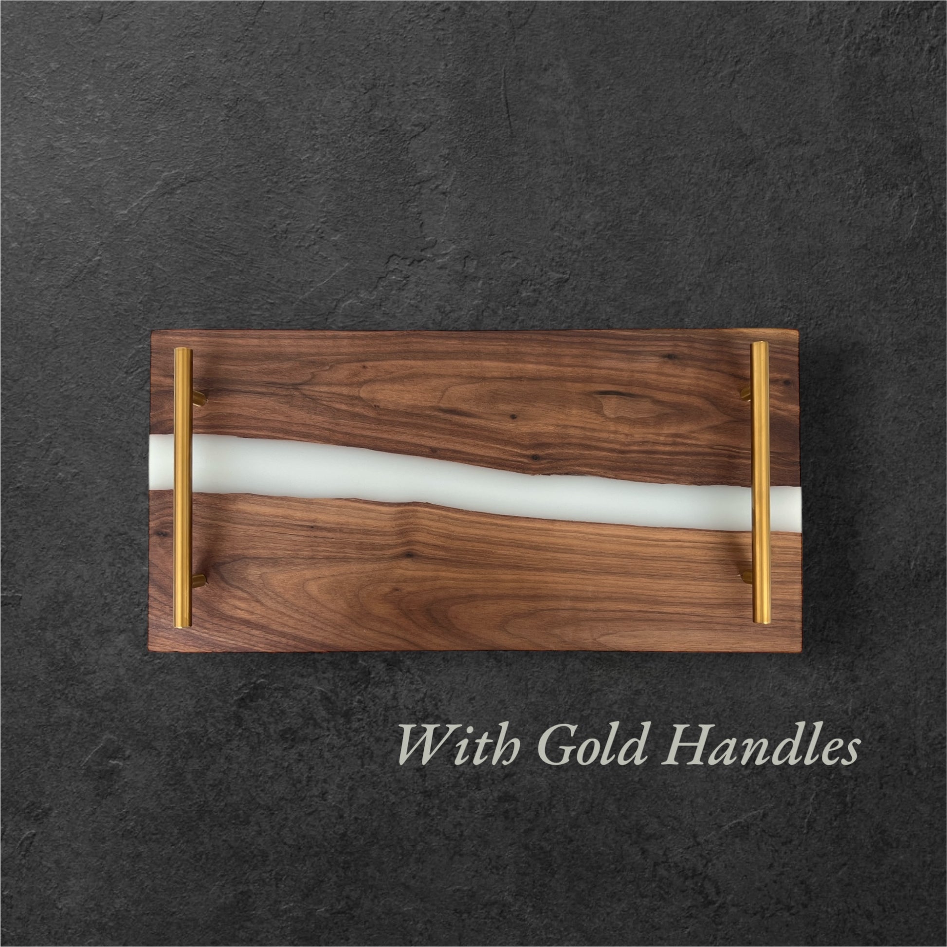 Two beautiful pieces of live-edge walnut wood come together with a river of resin, to create this stunning Personalized Resin Charcuterie Tray. We’ve added two champaign gold handles for an elegant touch, making each tray a truly unique piece. This tray serves as both a functional and artistic addition to any home.