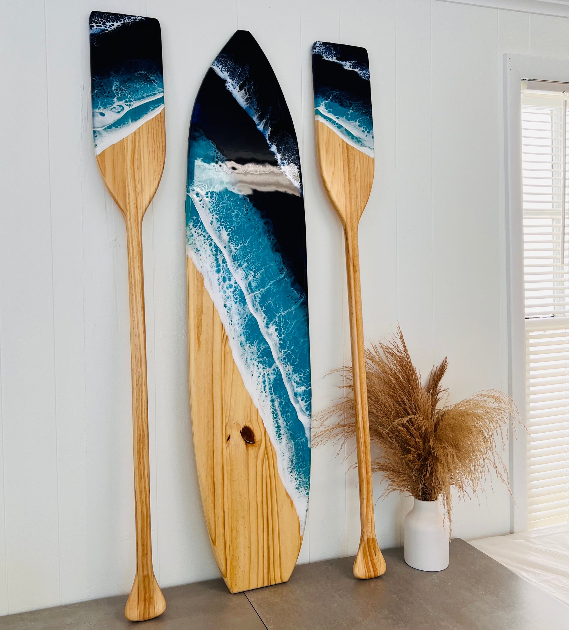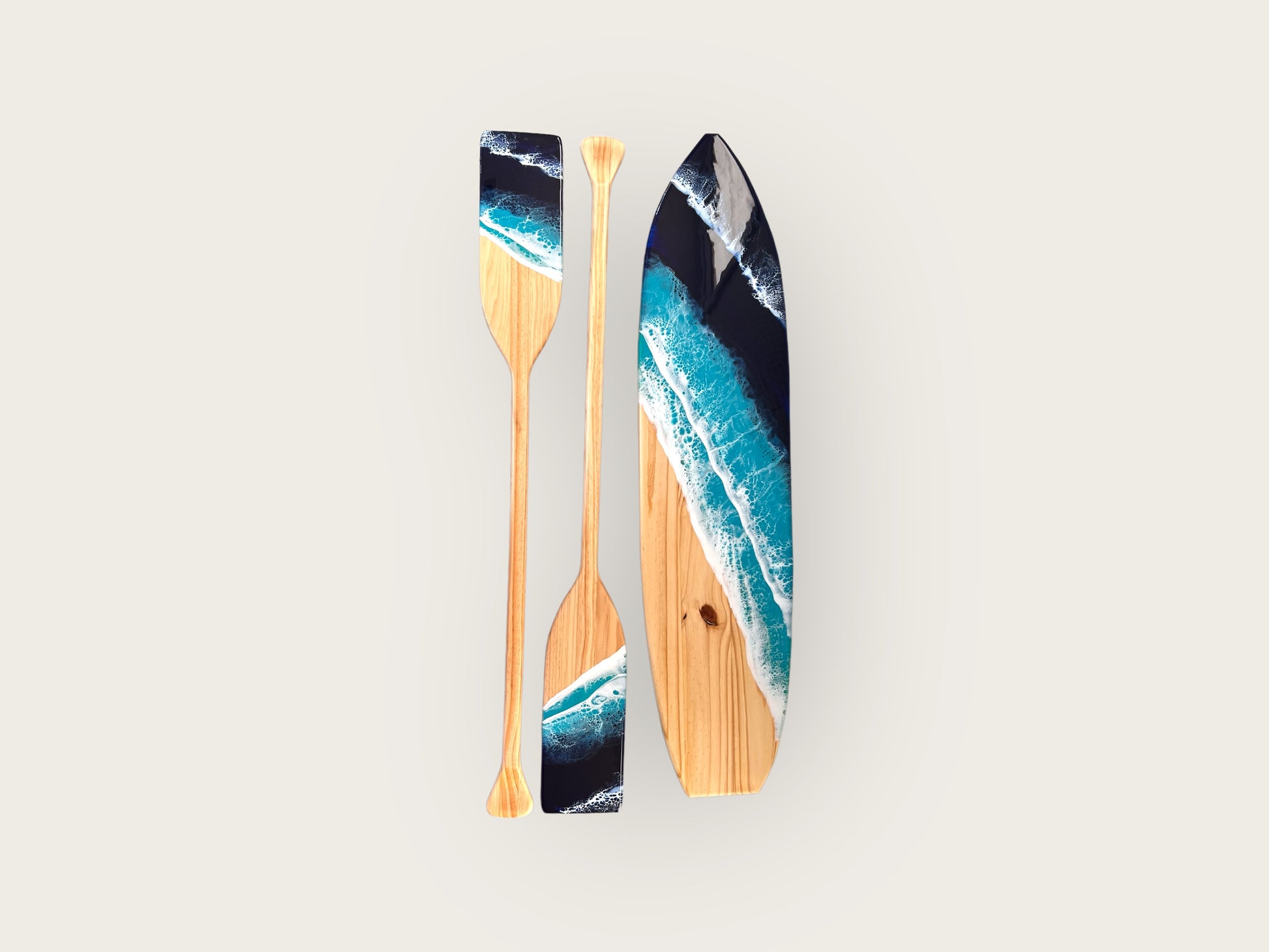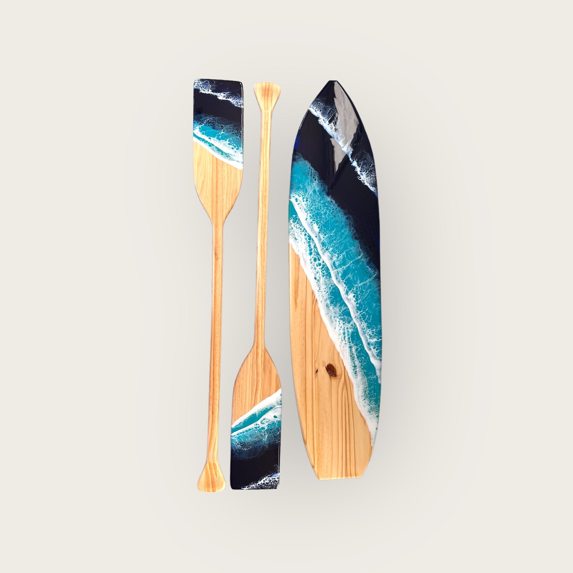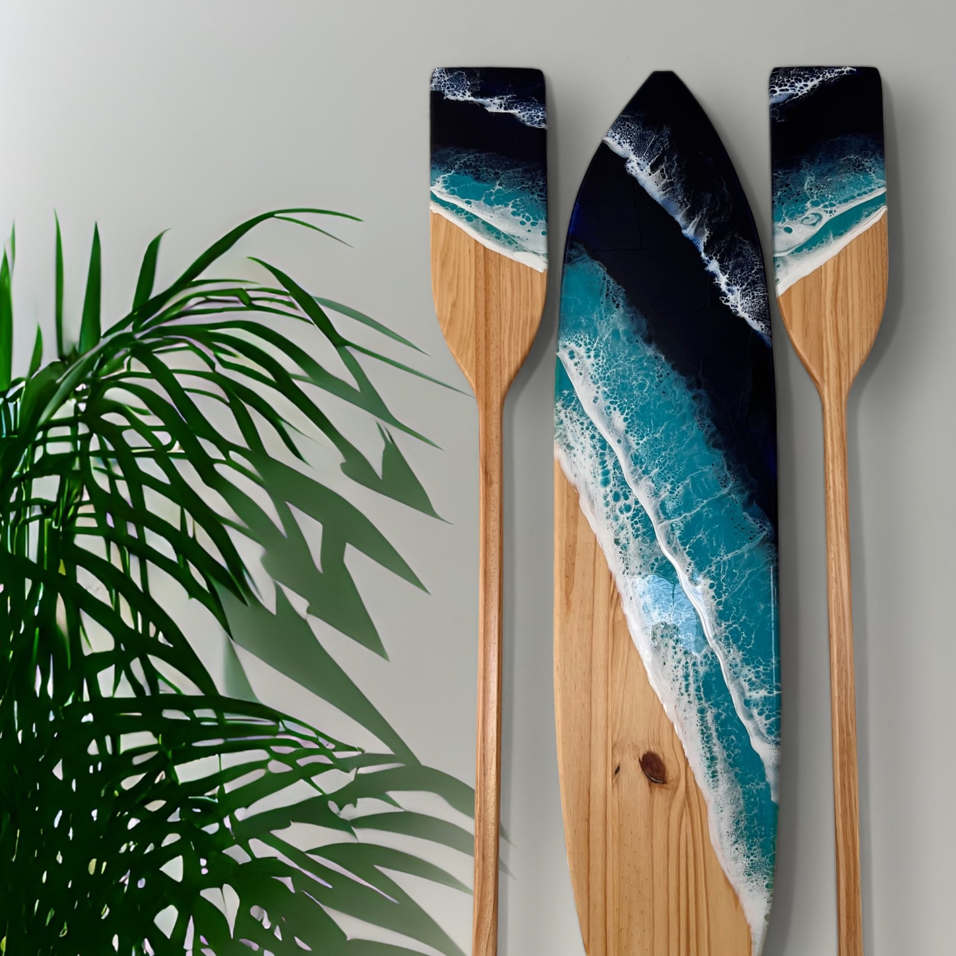 Bring the magic of the ocean into your home with our Handmade Personalized Surfboard and Oars Ocean Wave Wall Resin Art.