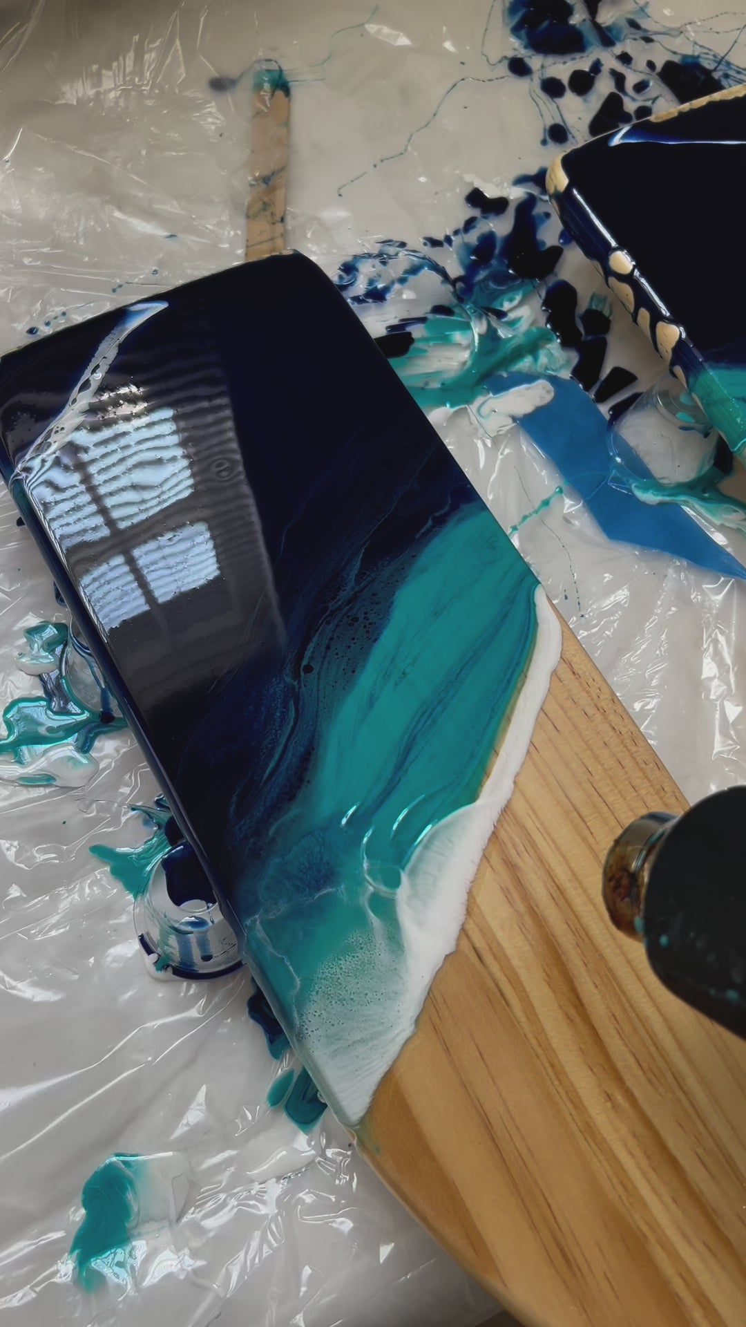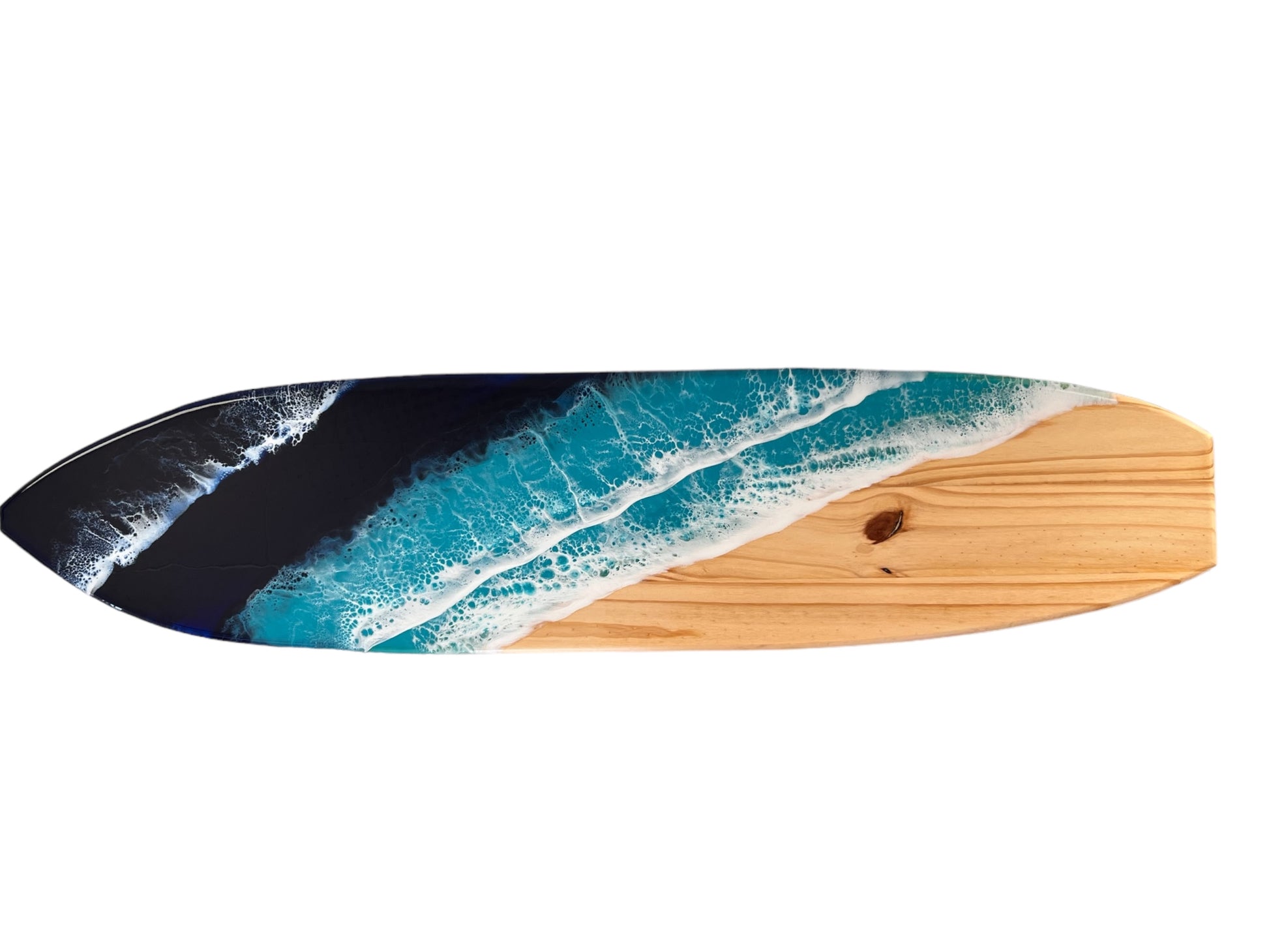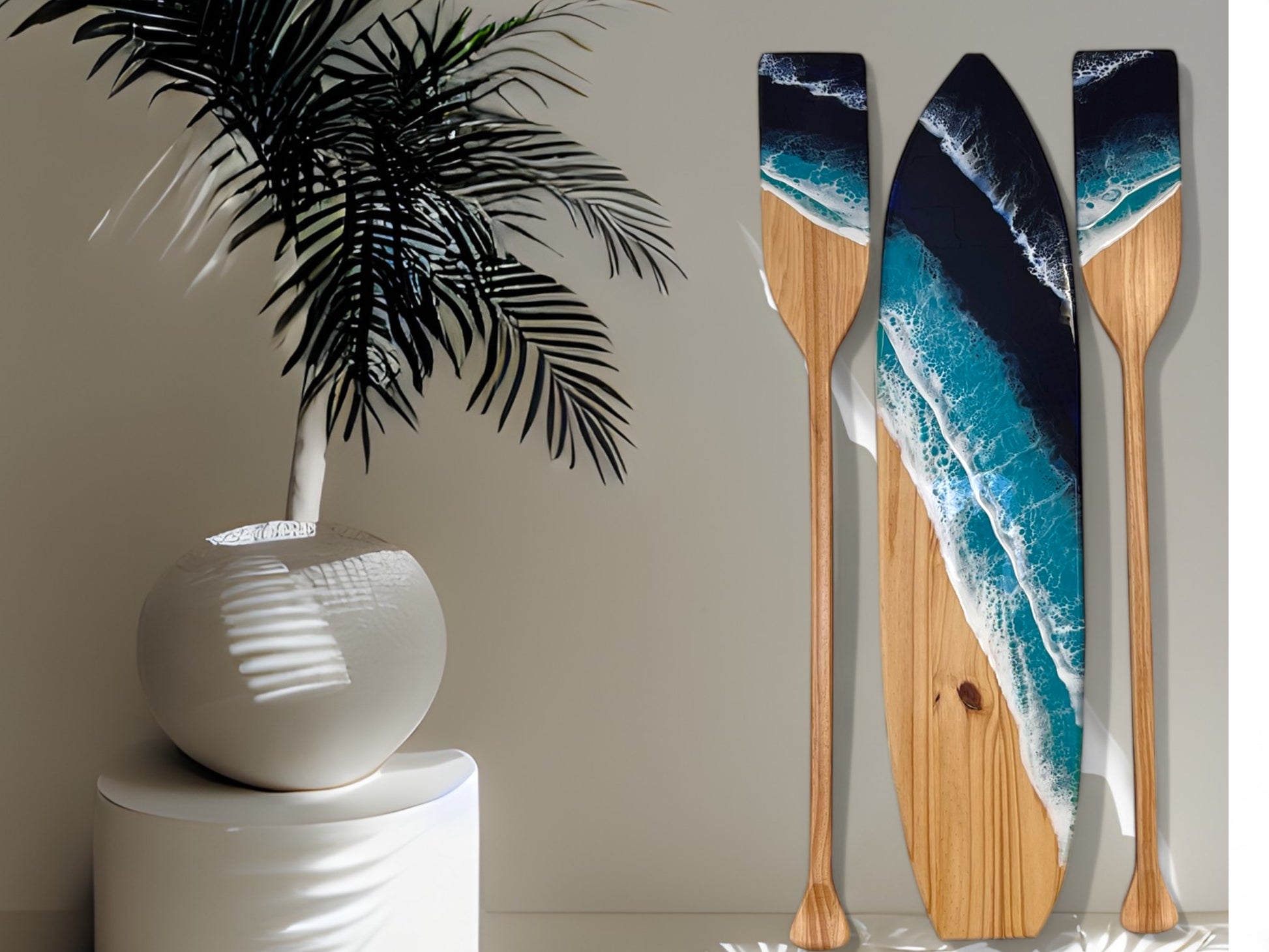 - Ocean-inspired resin art – Features stunning resin ocean waves with surfboards and oars for a unique coastal vibe.