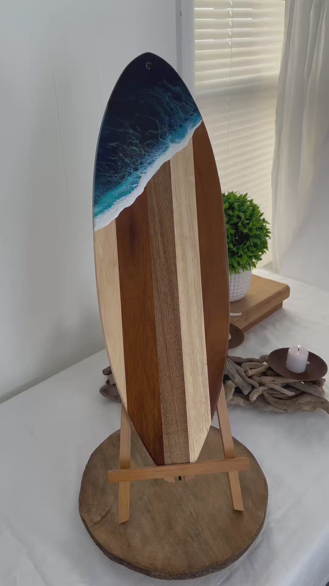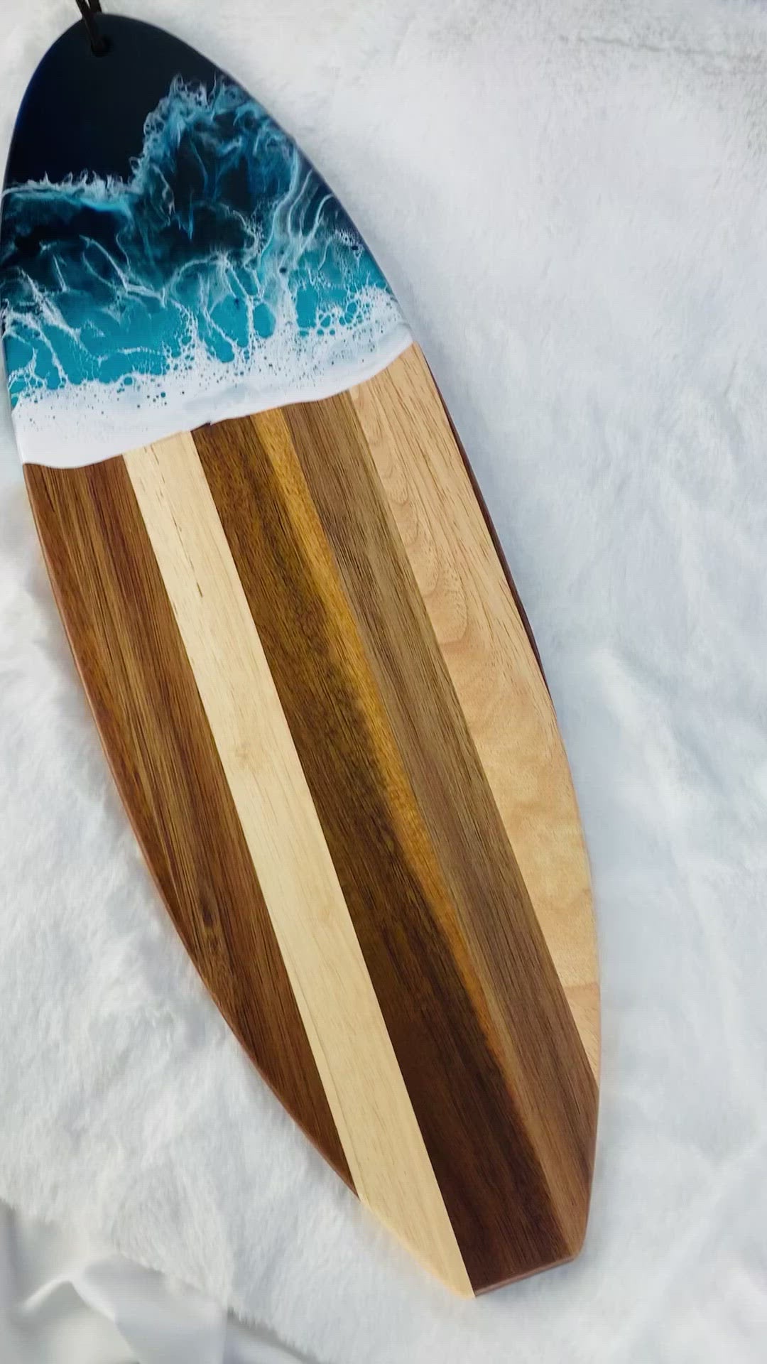 This surfboard-shaped cutting board features stunning ocean wave resin art, making it perfect for serving cheese, charcuterie, or appetizers. Made from premium acacia wood, it’s both a functional serving board and a beautiful coastal décor piece. Personalize it with a name, date, or special message to create a truly unique gift for any occasion