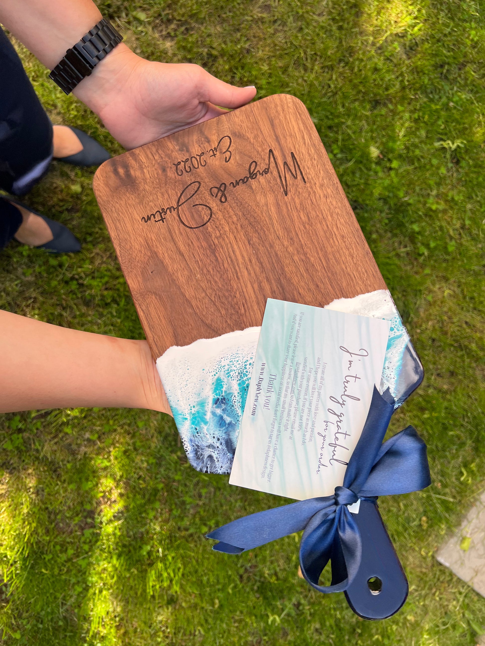 Our boards are fully functional and perfect for serving cheese, charcuterie, or appetizers. The wood side is safe for cutting, while the resin side is best for serving and displaying to preserve its beauty.