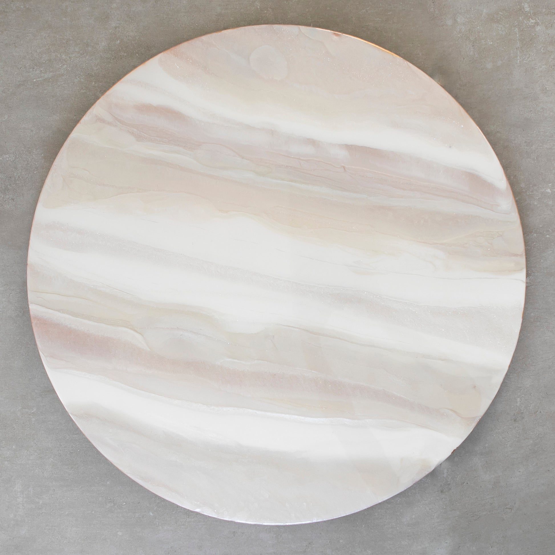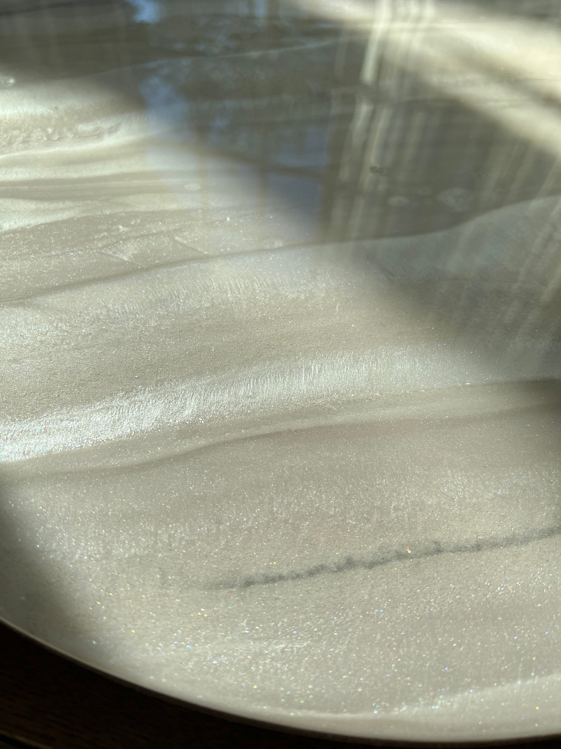 White Resin Lazy Susan, a stunning 20-inch wooden turntable that combines functionality with artistry. Handcrafted from premium wood, this large lazy susan features shimmery white resin designs in shades of whites, combined with touch of gold and diamond shine.This gorgeous piece is the fruit of three days of work. Wherever you place this glamorous piece it will be the center of attention and fully functional same time.